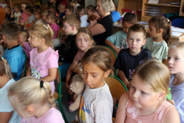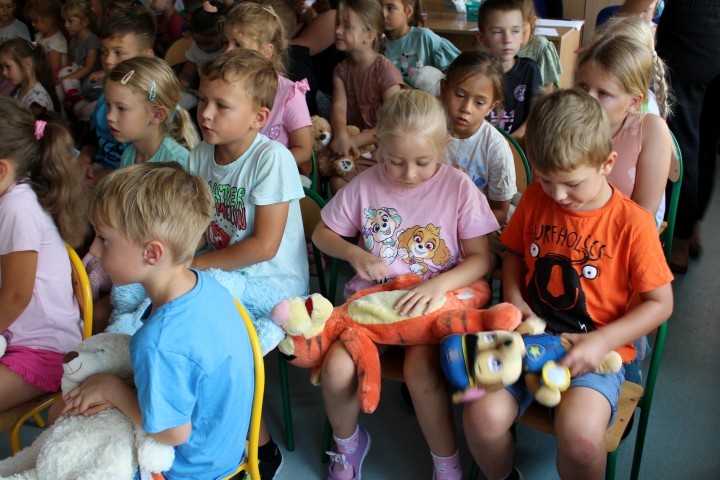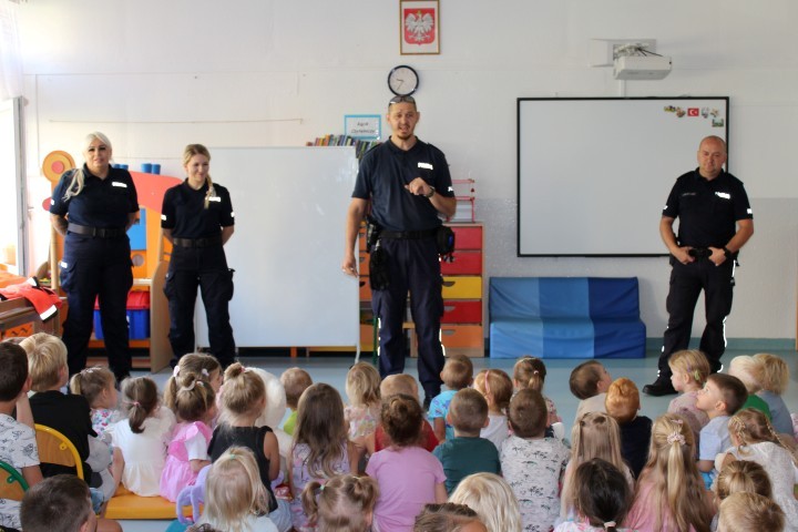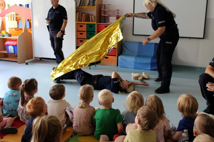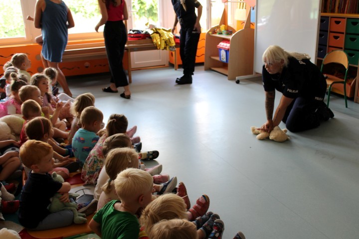 5 września w piątek nasze przedszkole odwiedzili wyjątkowi goście – policjanci. Podczas spotkania opowiedzieli dzieciom o zasadach udzielania pierwszej pomocy oraz pokazali przebieg resuscytacji. Następnie przedszkolaki miały okazję samodzielnie poćwiczyć na swoich misiach, ucząc się w praktyce, jak ważne jest szybkie reagowanie w sytuacjach zagrożenia.
