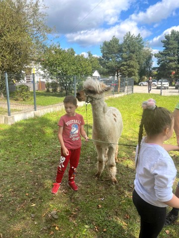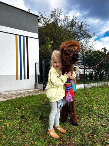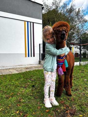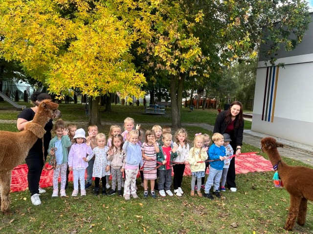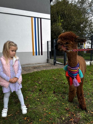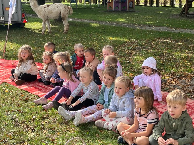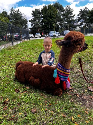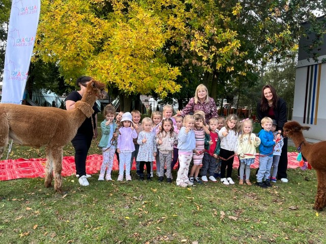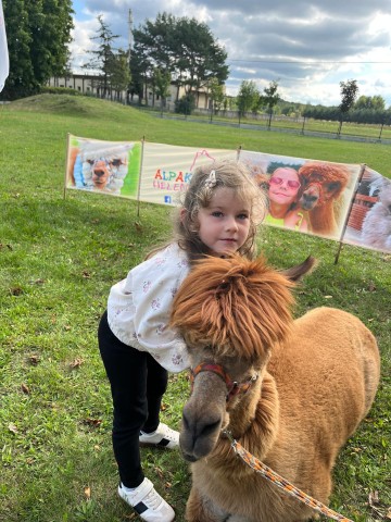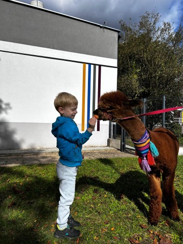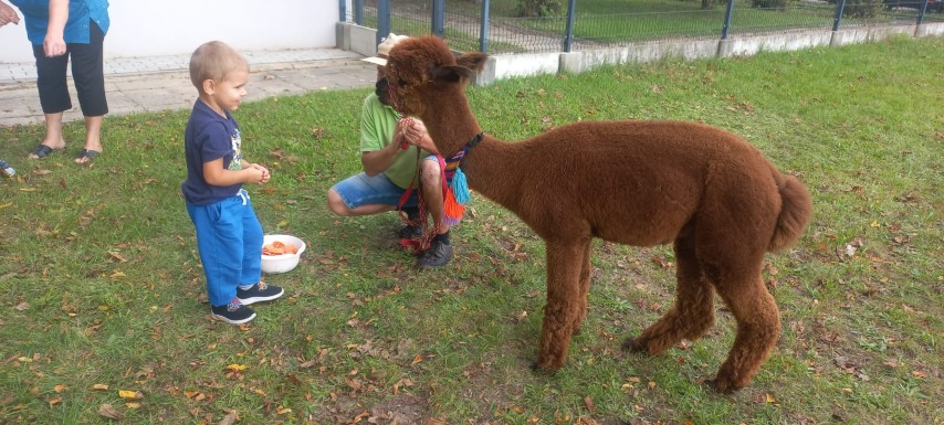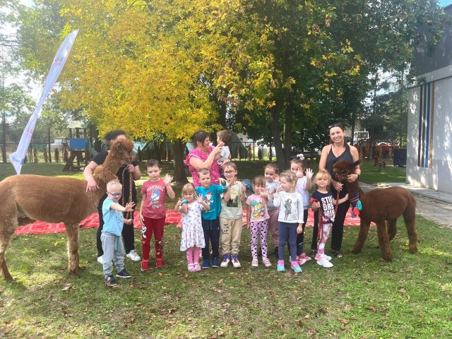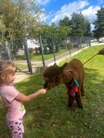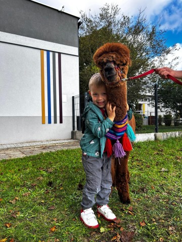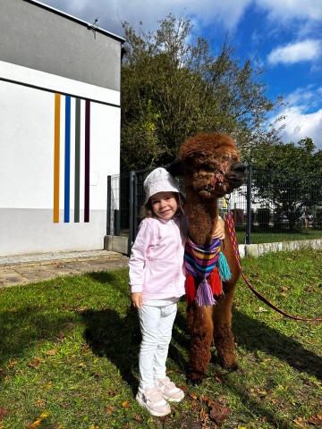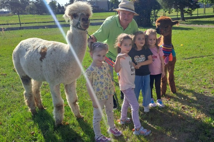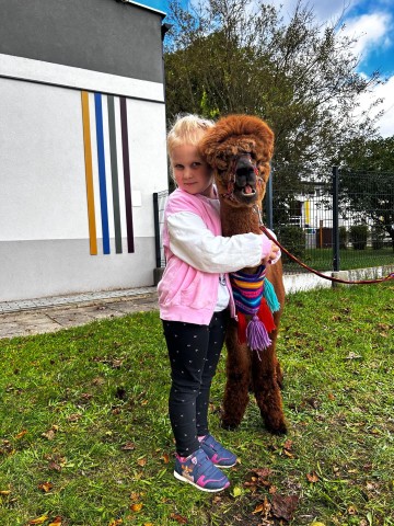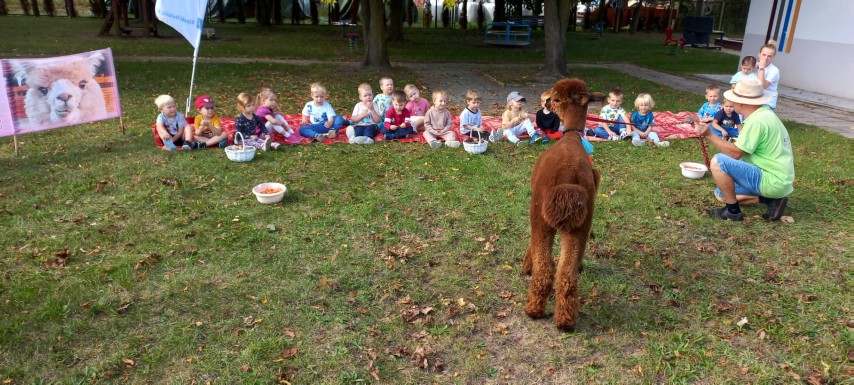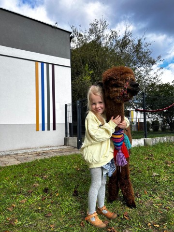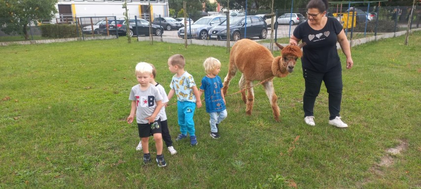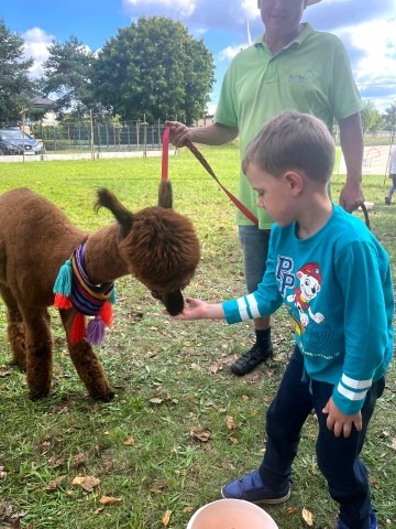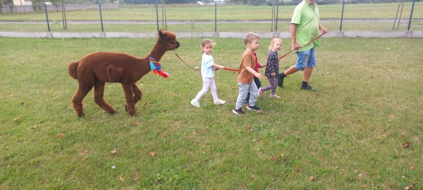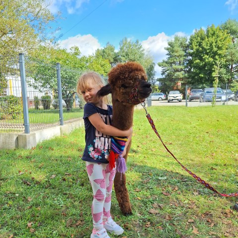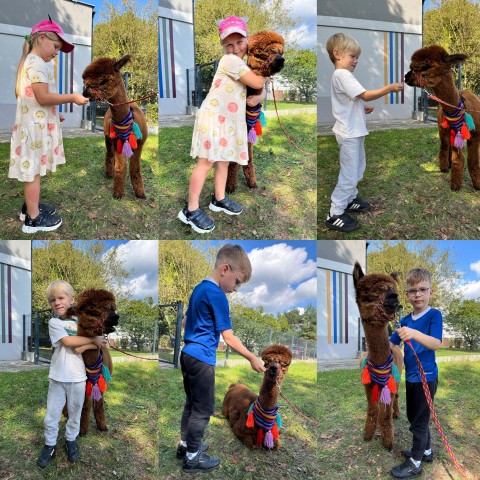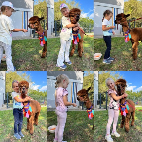 W każdej grupie kulminacyjnym momentem było dotkniecie ramienia specjalnym ,, czarodziejskim ołówkiem", który zmienił dzieci w prawdziwych maluchów, średniaków młodszych i starszych, starszaków. Ten dzień na długo zostanie w naszej pamięci- bo czy może być coś lepszego niż świętowanie w towarzystwie miękkich puszystych przyjaciół Alpak??? Dzieci miały okazję przyjrzeć się tym sympatycznym zwierzętom z bliska, pogłaskać, nakarmić oraz zrobić pamiątkowe zdjęcia.