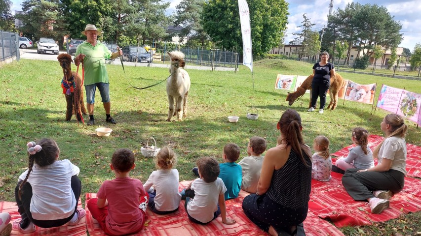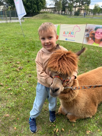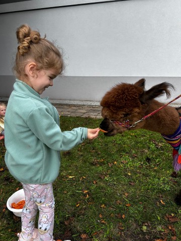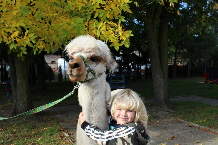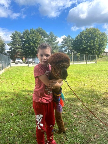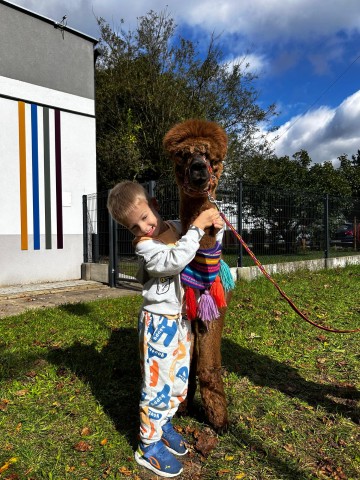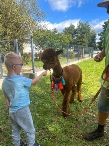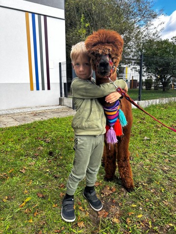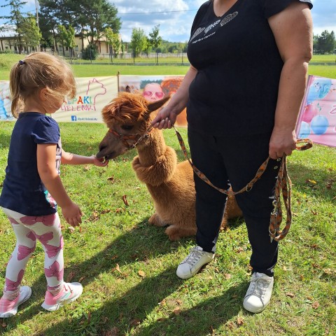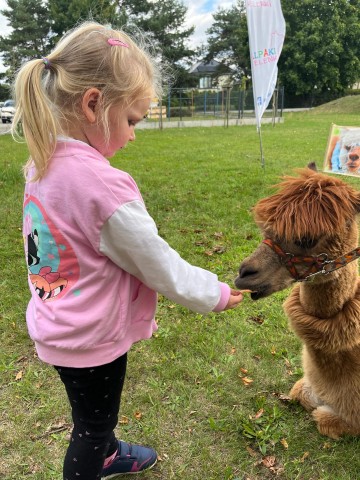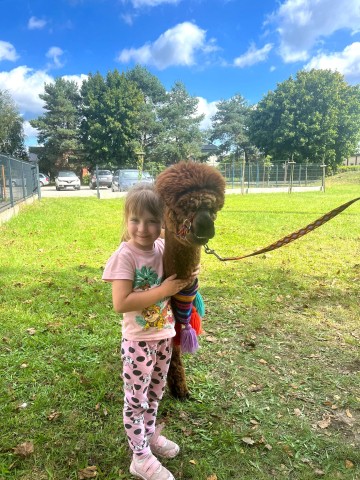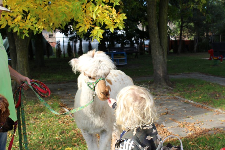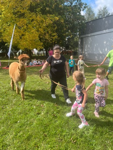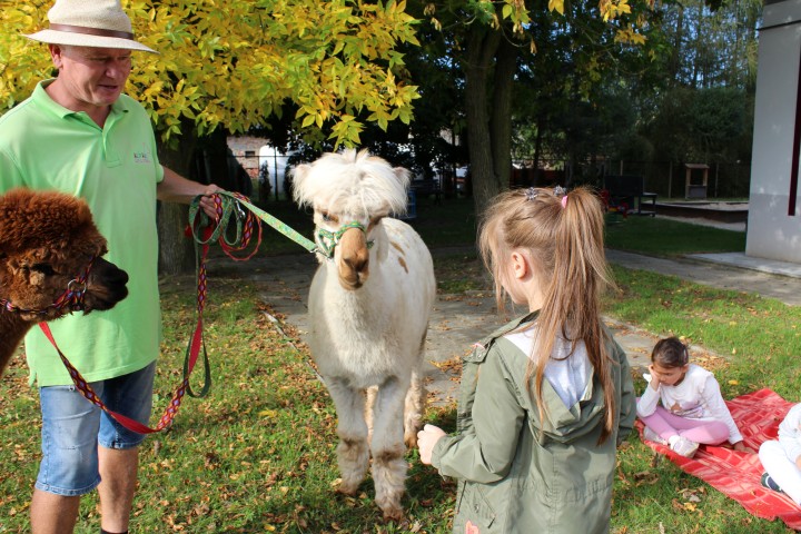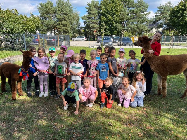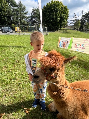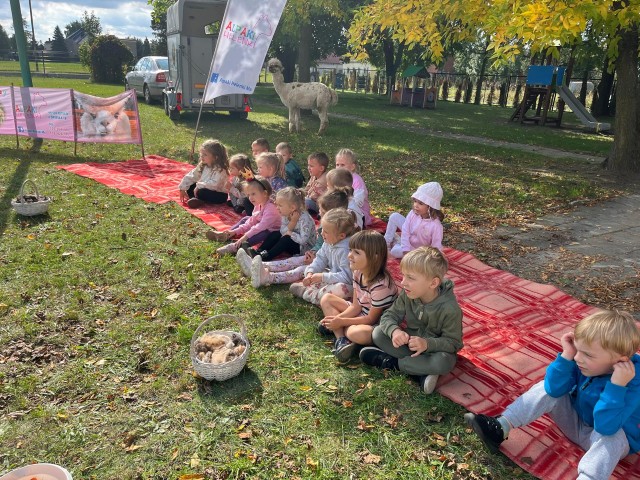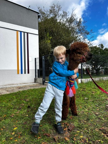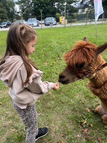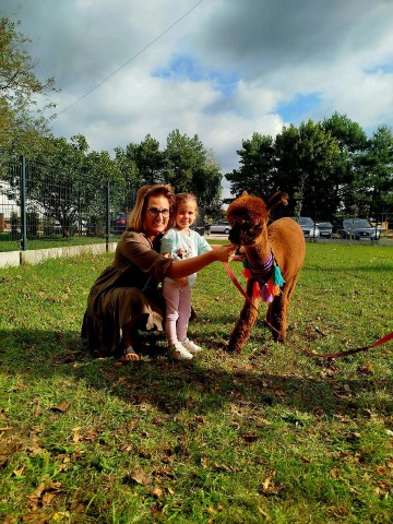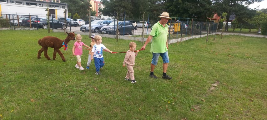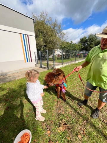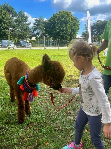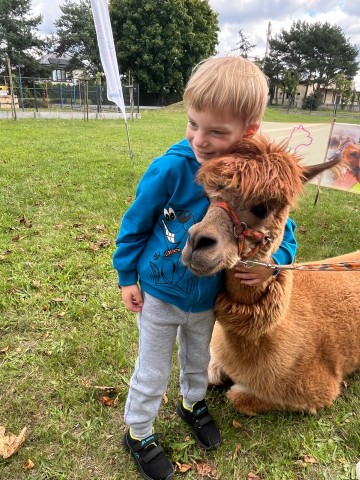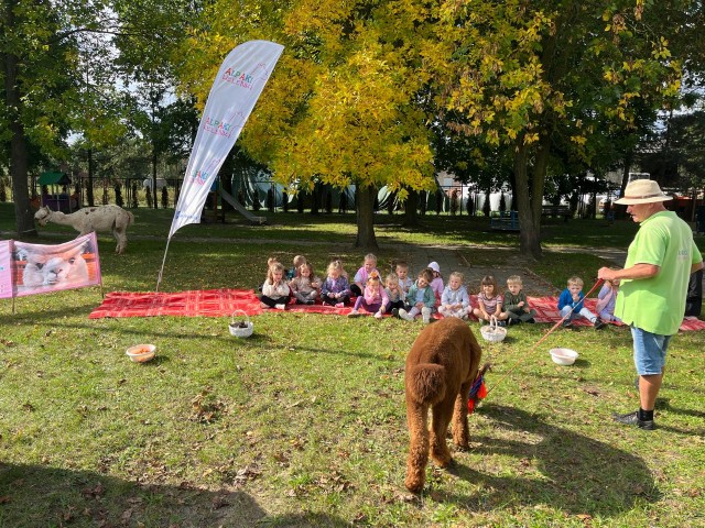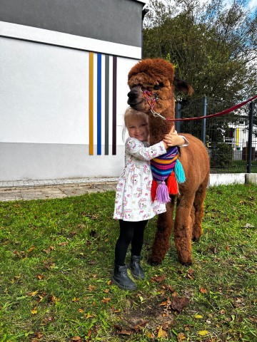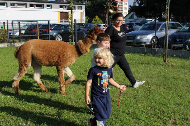 W każdej grupie kulminacyjnym momentem było dotkniecie ramienia specjalnym ,, czarodziejskim ołówkiem", który zmienił dzieci w prawdziwych maluchów, średniaków młodszych i starszych, starszaków. Ten dzień na długo zostanie w naszej pamięci- bo czy może być coś lepszego niż świętowanie w towarzystwie miękkich puszystych przyjaciół Alpak??? Dzieci miały okazję przyjrzeć się tym sympatycznym zwierzętom z bliska, pogłaskać, nakarmić oraz zrobić pamiątkowe zdjęcia.