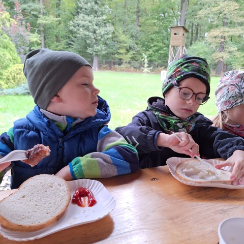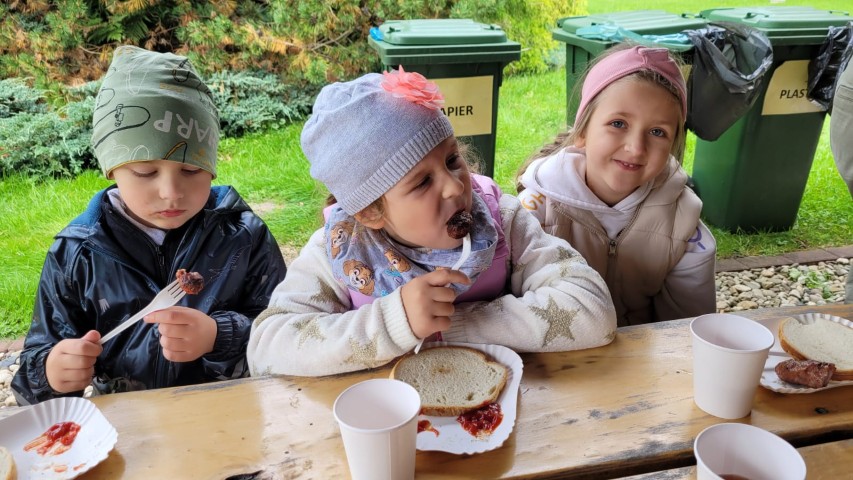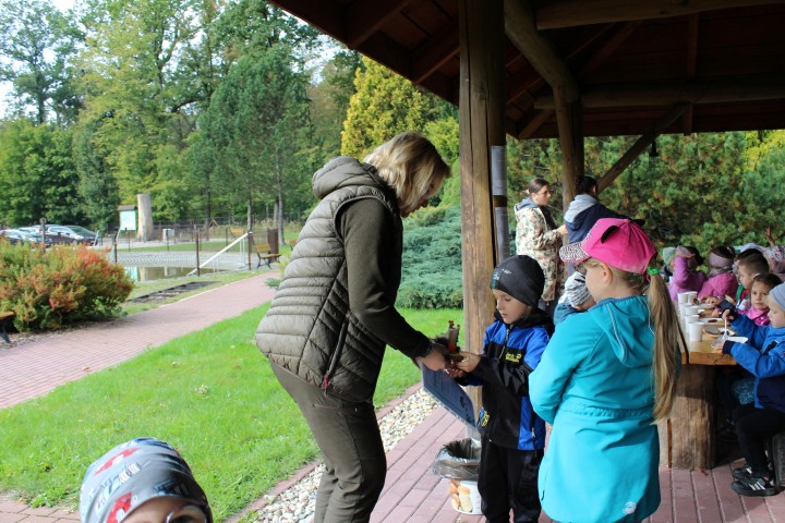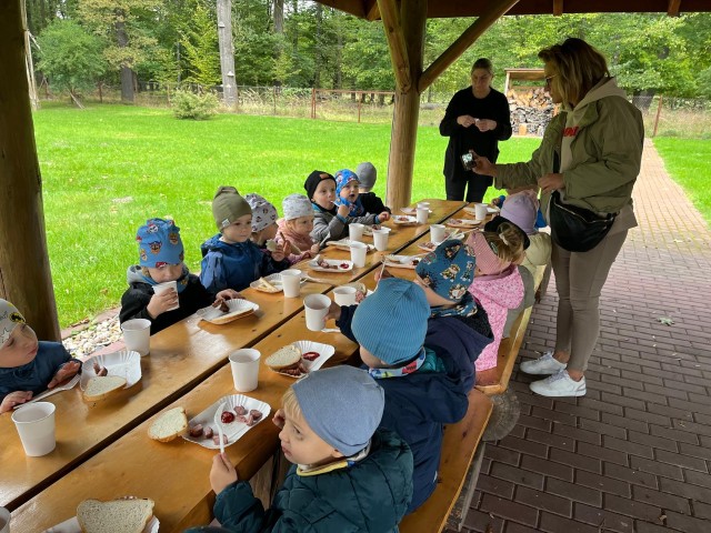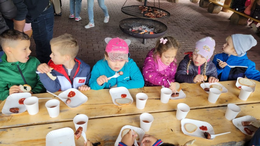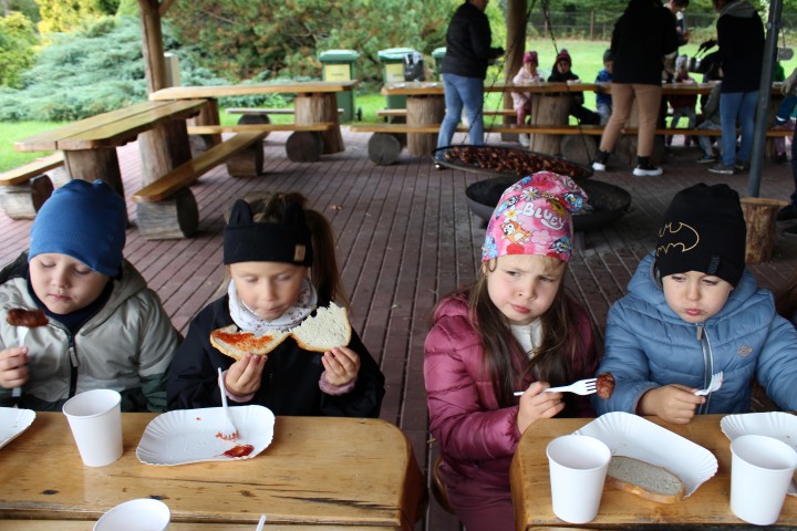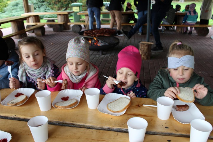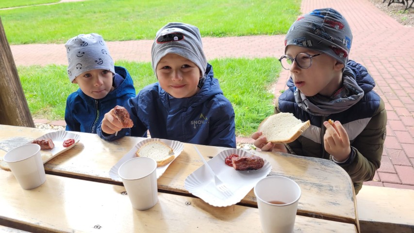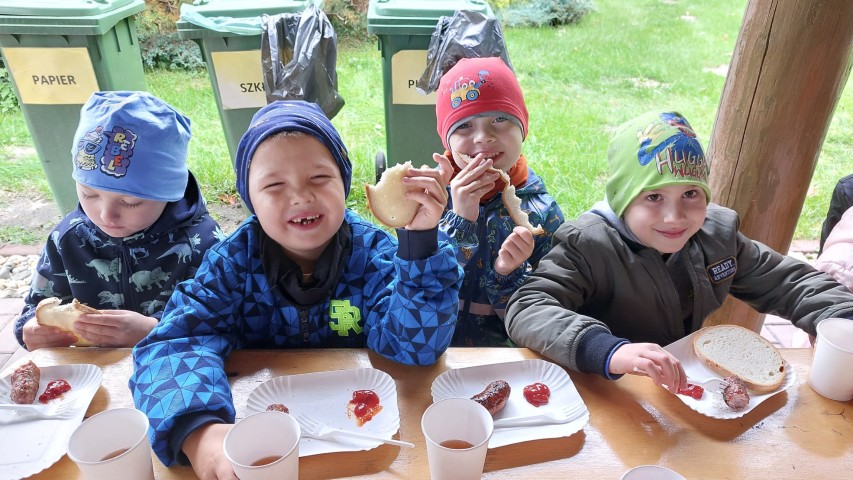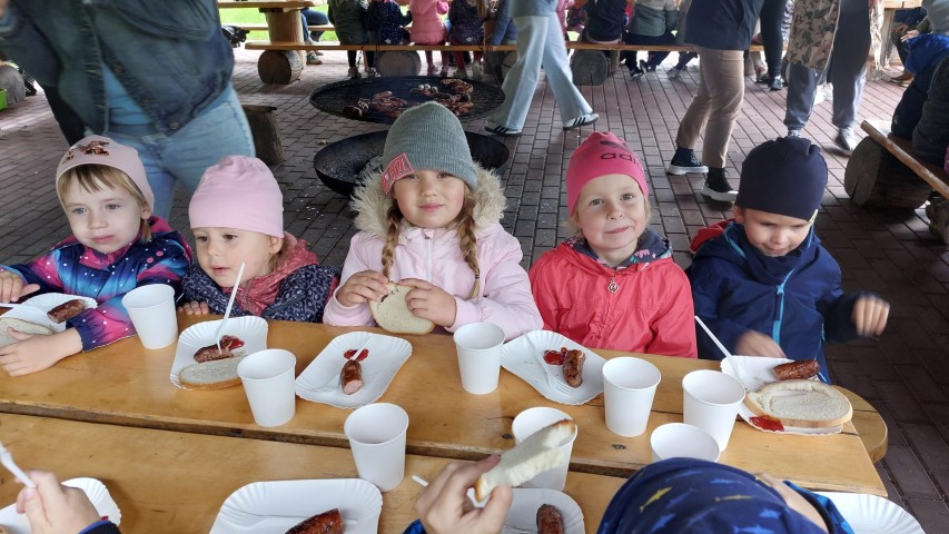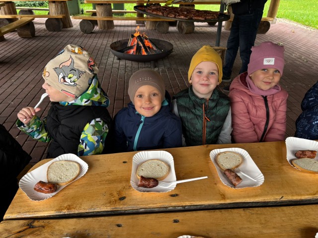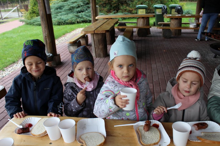 Mali przyrodnicy mogli zobaczyć eksponaty zwierząt i ptaków mieszkających w naszych lasach oraz poznać tajemnice lasu i usłyszeć odgłosy jego mieszkańców. Spacerując ścieżką edukacyjną, obserwowaliśmy naturalny ekosystem świata roślin i zwierząt. Na zakończenie czekała nas pyszna kiełbaska z grilla. Wszyscy wróciliśmy do przedszkola z uśmiechami na twarzach oraz z przekonaniem , że w lesie należy zachować ciszę i spokój.