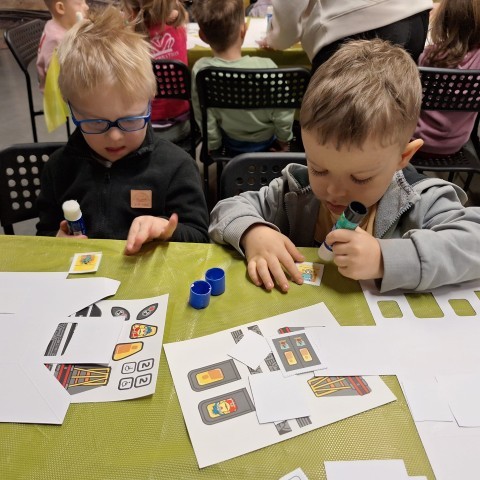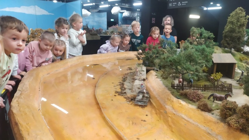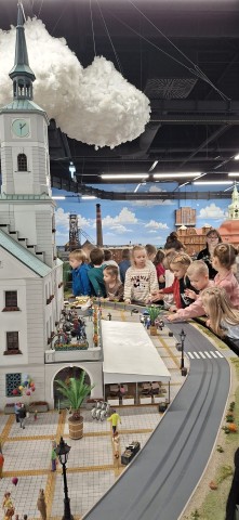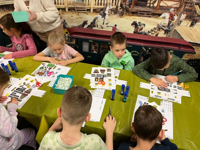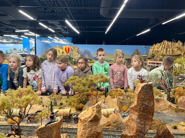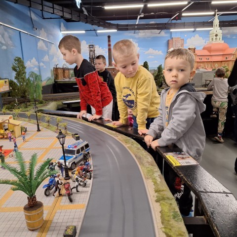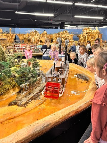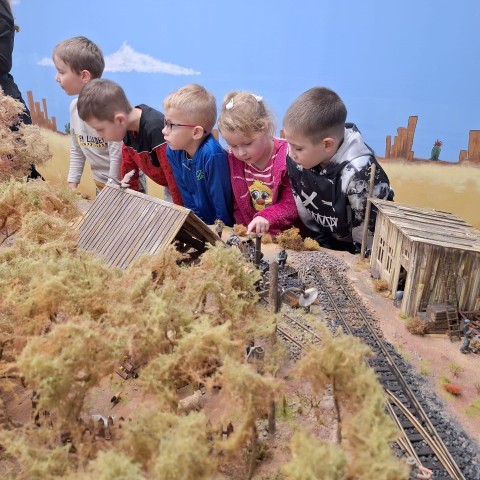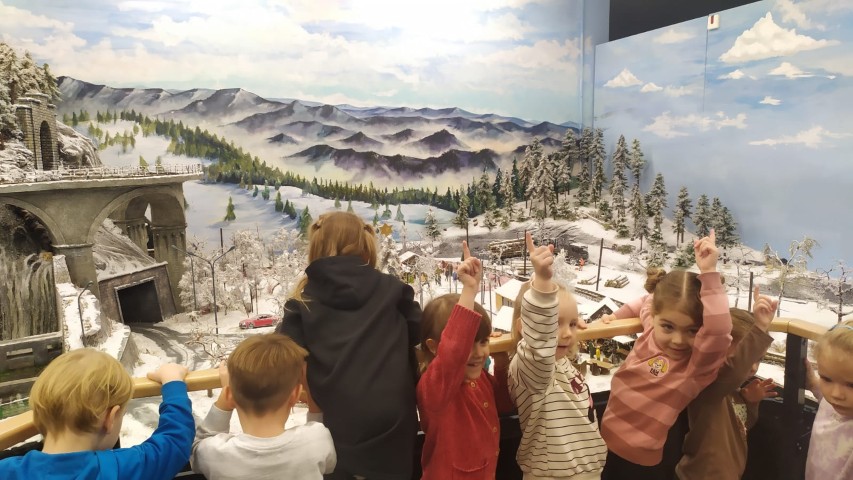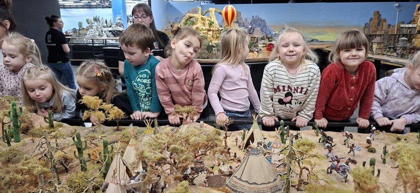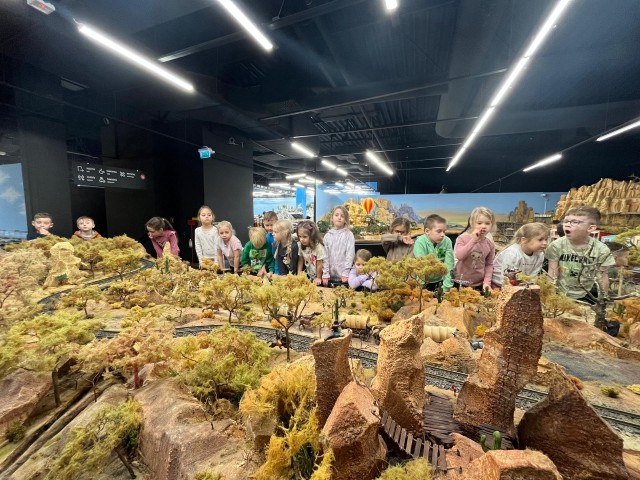 Duże emocje wzbudziła również makieta w stylu Dzikiego Zachodu, gdzie szukaliśmy Chudego z Toy Story. Następnie zobaczyliśmy niezwykłą scenę, na której z chmury padał prawdziwy deszcz na miniaturowe miasteczko — dzieci były oczarowane tym widokiem! Nie zabrakło też zimowej makiety, pełnej śniegu, która wprowadziła wszystkich w magiczny nastrój. W trakcie zwiedzania szukaliśmy też innych ukrytych postaci — dzieci wypatrywały m.in. Spidermana, co okazało się świetną zabawą i ćwiczeniem spostrzegawczości. Po obejrzeniu wszystkich ekspozycji wzięliśmy udział w warsztatach plastycznych, podczas których każdy z przedszkolaków mógł wykonać coś wyjątkowego — blok lub pociąg z papieru. Trzeba było wszystko wyciąć, skleić, pokolorować i złożyć — dzieci pracowały z ogromnym zaangażowaniem, a efekty ich pracy były naprawdę imponujące. To była wyjątkowa wycieczka, pełna radości, odkryć i wspólnej zabawy — z pewnością na długo pozostanie w pamięci wszystkich dzieci!