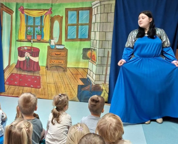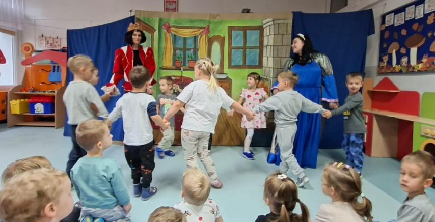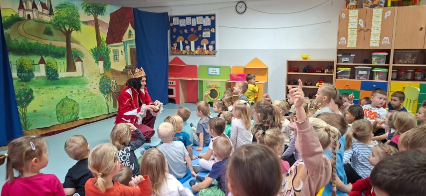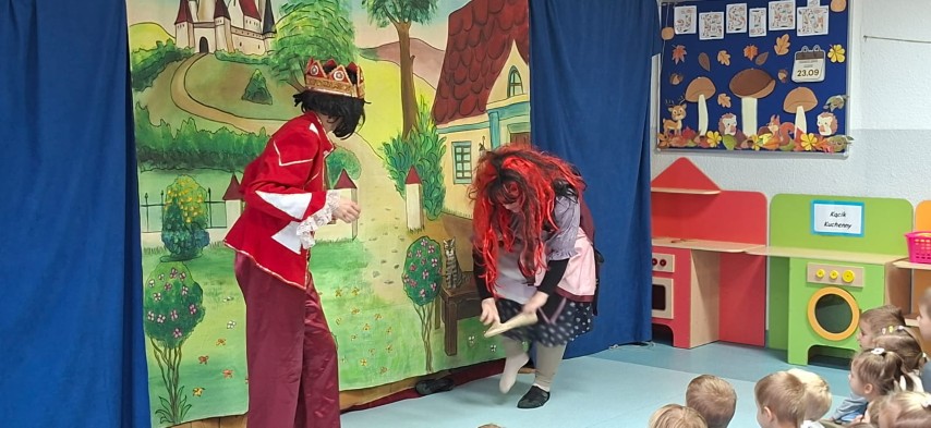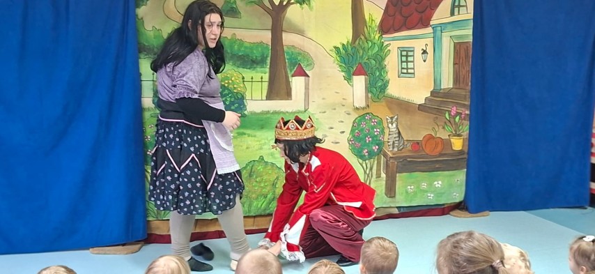 W poniedziałkowy ranek odwiedzili nas aktorzy teatru KRAK-ART z Krakowa. Na naszej przedszkolnej scenie pojawili się Kopciuszek, zła macocha oraz przystojny książę. Mogliśmy aktywnie brać udział w przedstawieniu —na chwilę wcielić się w role aktorów, wystąpić przed publicznością, a na zakończenie zatańczyć na weselu Kopciuszka i księcia.