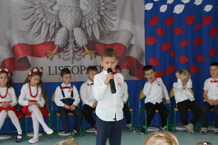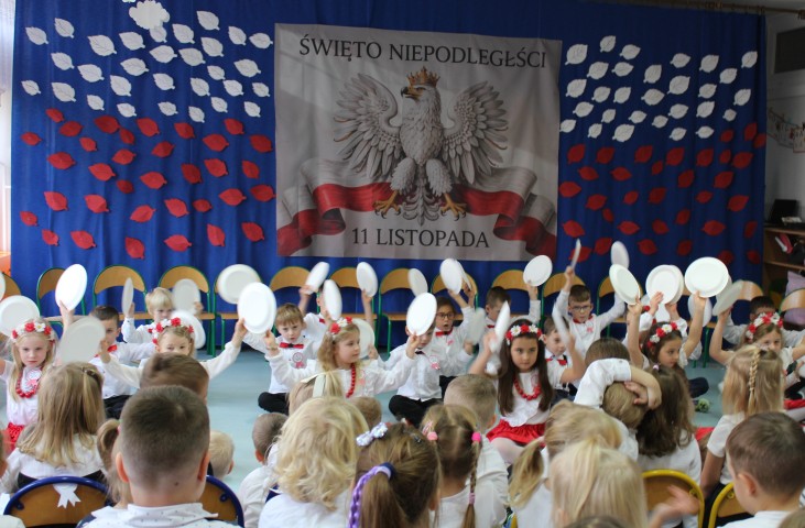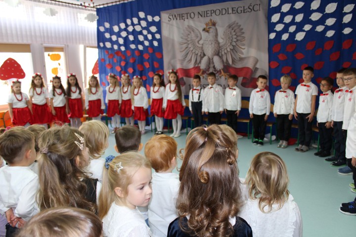 W naszym przedszkolu uroczyście obchodziliśmy Dzień Niepodległości. W dniu 12 listopada wszystkie grupy zebrały się, aby uczcić to wyjątkowe dla Polaków święto. Z tej okazji dzieci z grupy „Pszczółki” przygotowały piękny występ artystyczny. Podczas prezentacji przedszkolaki recytowały patriotyczne wiersze opowiadające o historii Polski.
