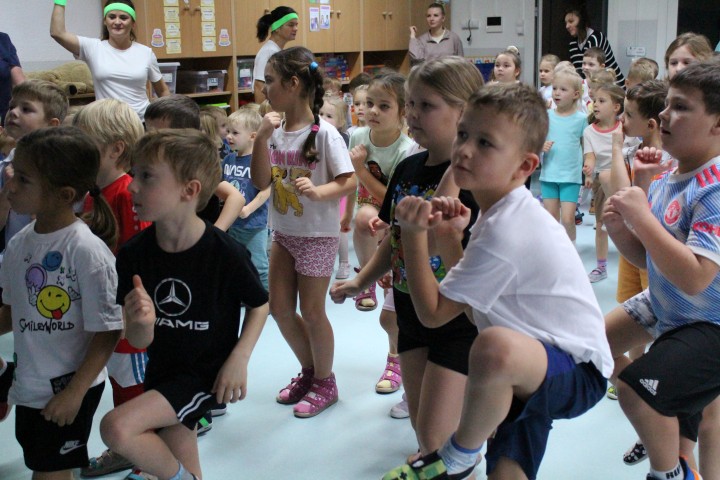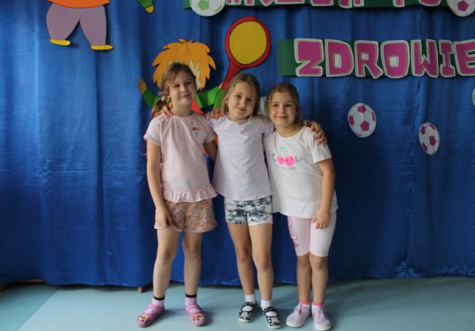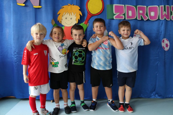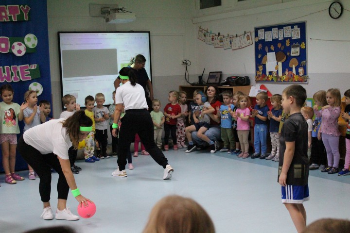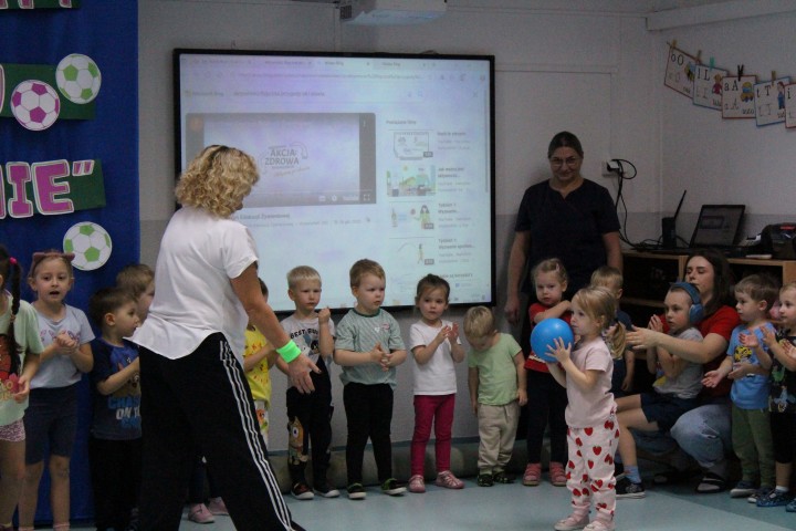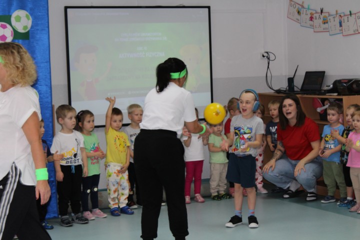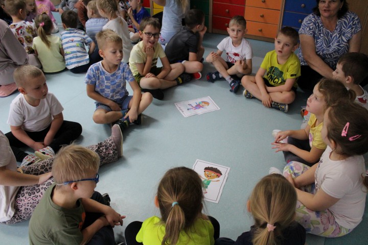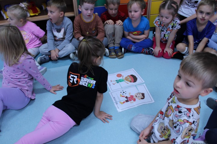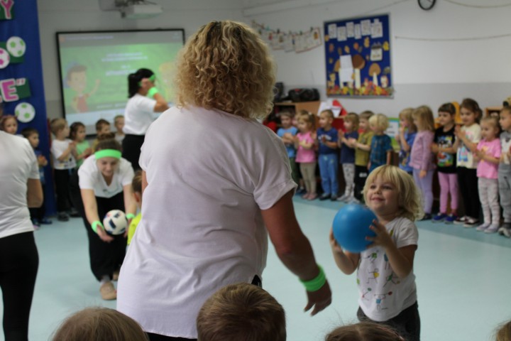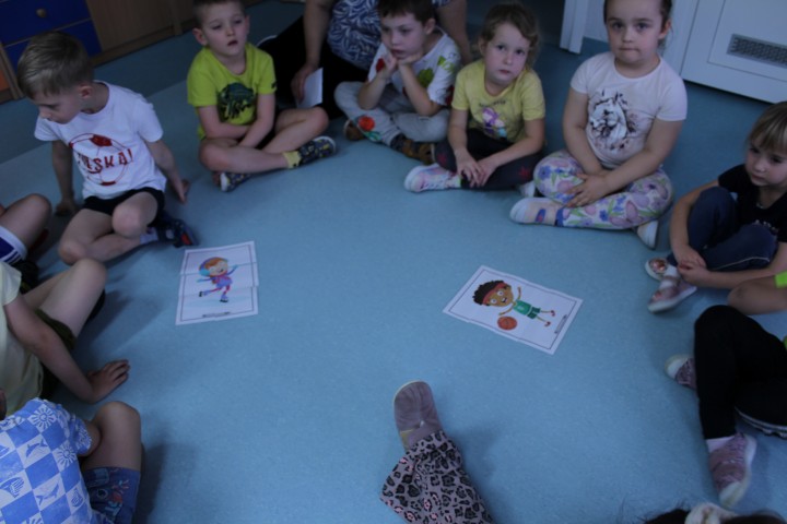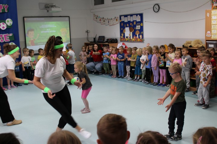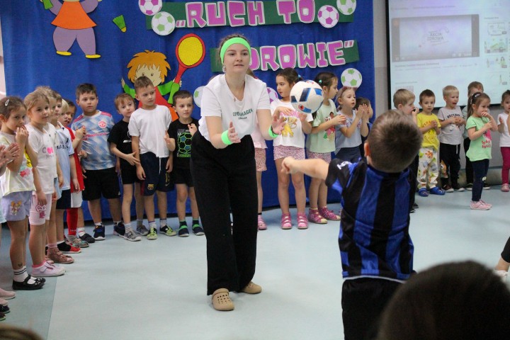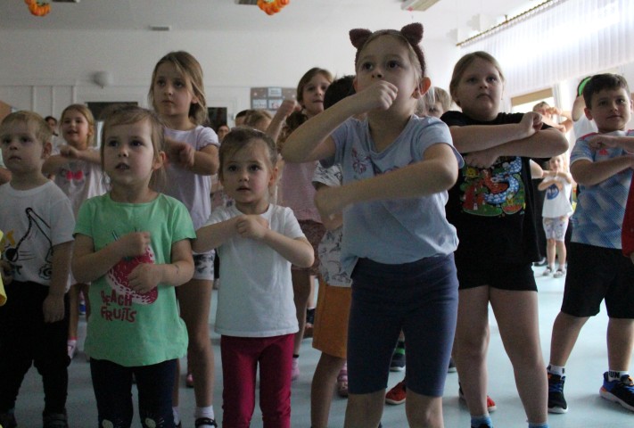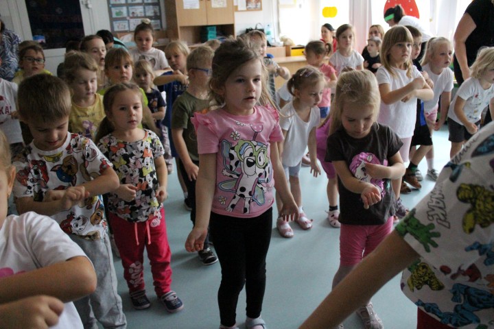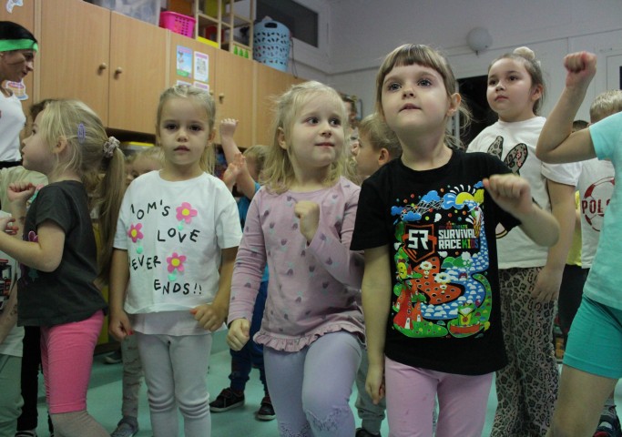 Hasło przewodnie tego dnia to "Ruch to zdrowie - aktywne przedszkolaki”. Nasze przedszkolne panie trenerki: Karolina, Asia, Bożena, Ewelina i Basia zachęcając do aktywności fizycznej przedstawiły film edukacyjny o potrzebie ruchu dla zdrowia. Następnie wszyscy zostaliśmy zaproszeni do zabaw ruchowych tj. ,,Tańcz i baw się z nami”, "Kolanko, kolanko”, Gąsienica”. Pani Karolina zaprezentowała nam strój karate oraz opowiedziała na czym polega trening i dlaczego warto trenować karate. Poznaliśmy różne dyscypliny sportowe układając puzzle w zespołach.
