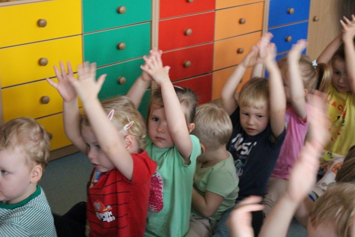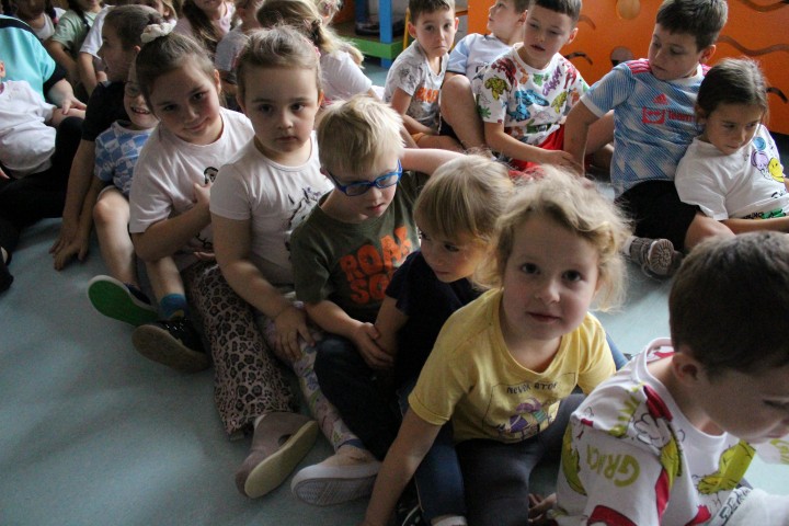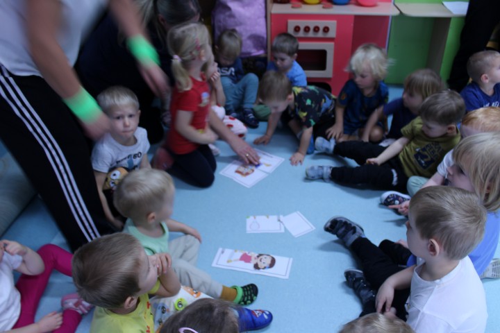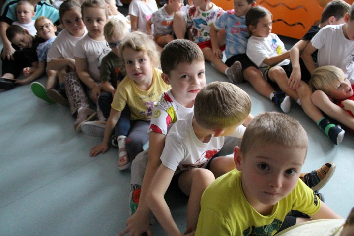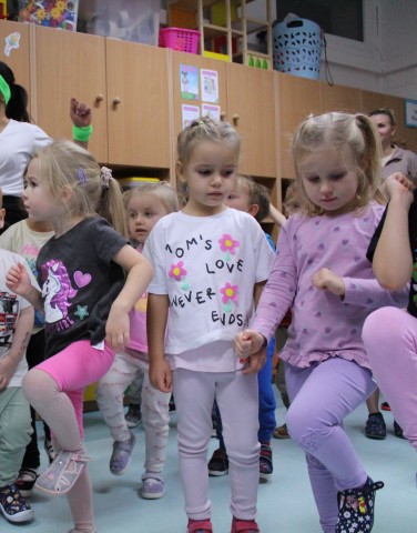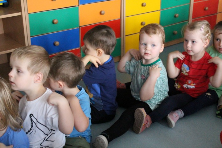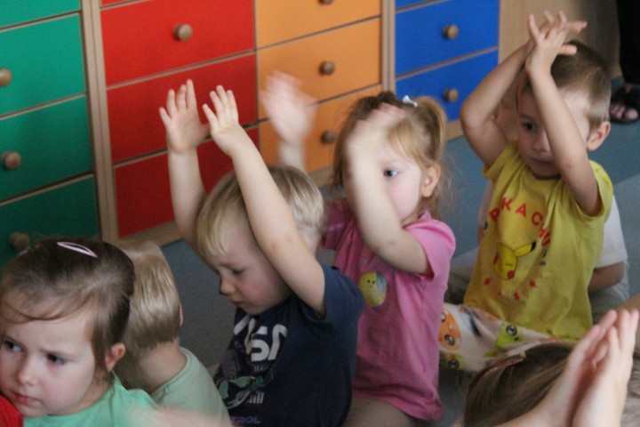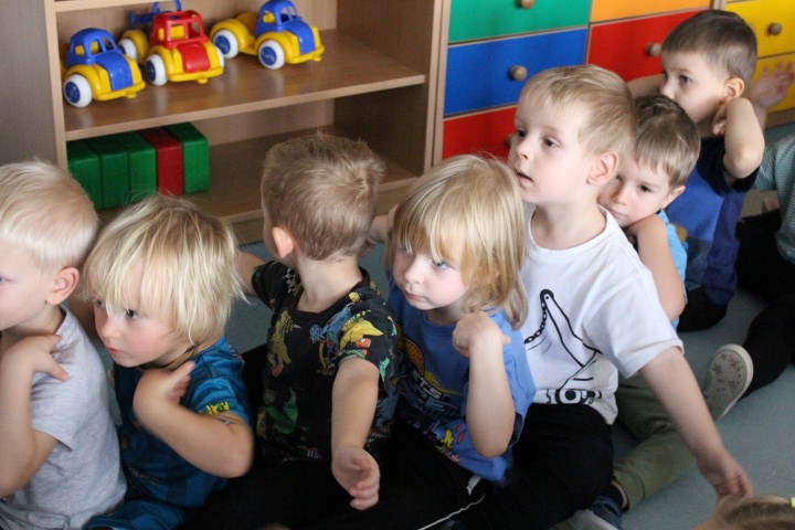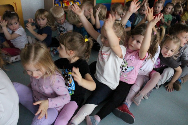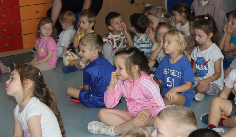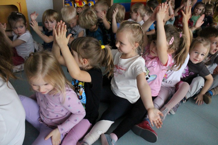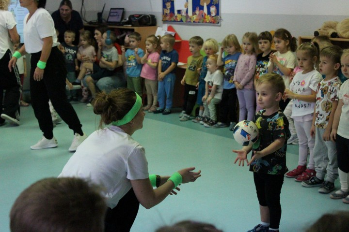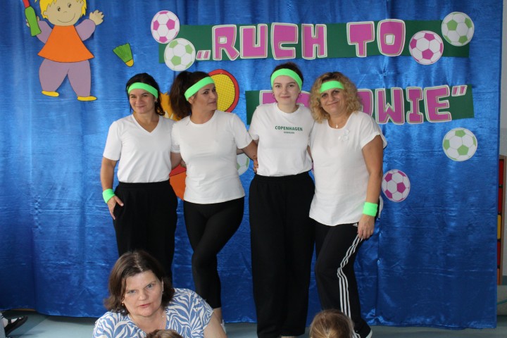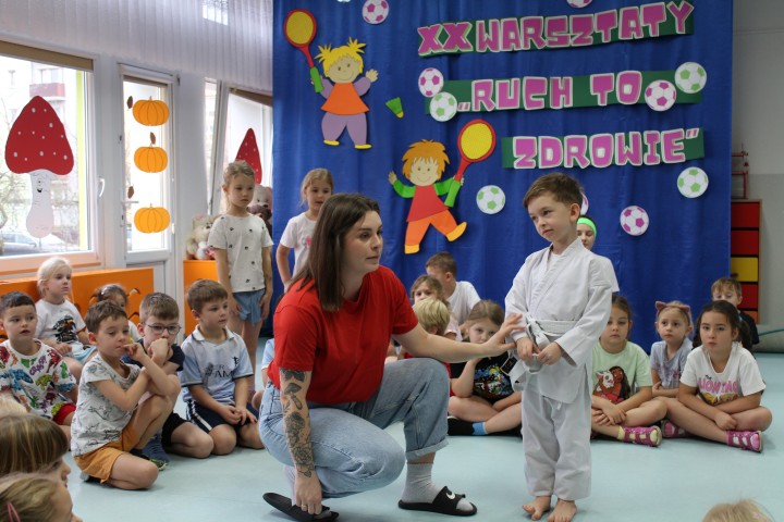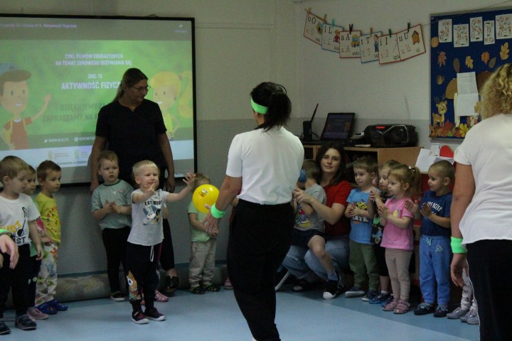 Hasło przewodnie tego dnia to "Ruch to zdrowie - aktywne przedszkolaki”. Nasze przedszkolne panie trenerki: Karolina, Asia, Bożena, Ewelina i Basia zachęcając do aktywności fizycznej przedstawiły film edukacyjny o potrzebie ruchu dla zdrowia. Następnie wszyscy zostaliśmy zaproszeni do zabaw ruchowych tj. ,,Tańcz i baw się z nami”, "Kolanko, kolanko”, Gąsienica”. Pani Karolina zaprezentowała nam strój karate oraz opowiedziała na czym polega trening i dlaczego warto trenować karate. Poznaliśmy różne dyscypliny sportowe układając puzzle w zespołach.