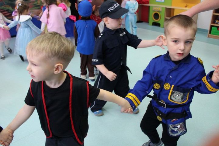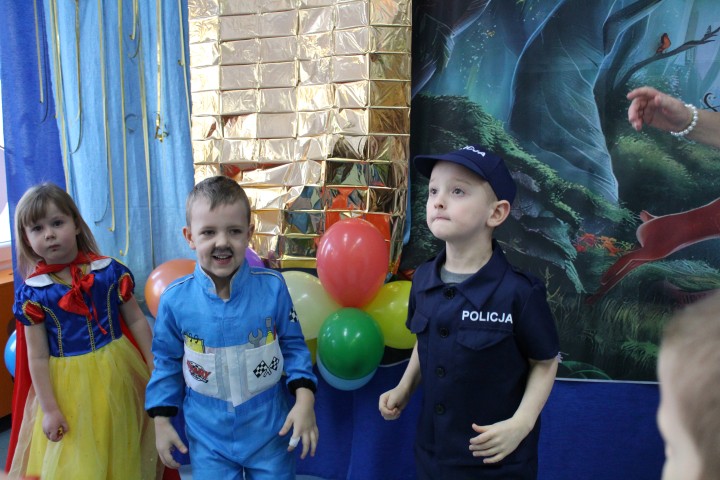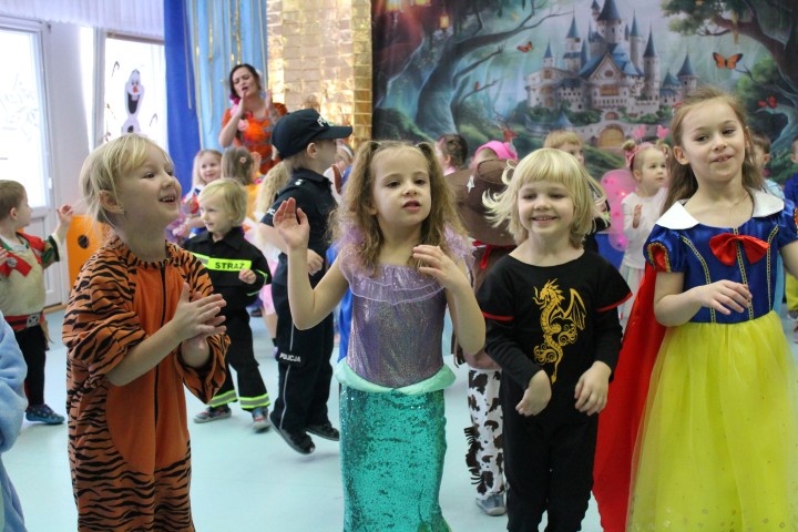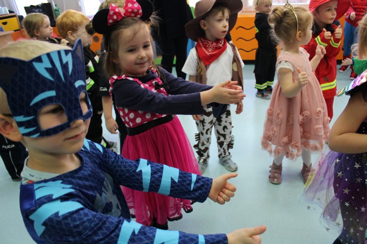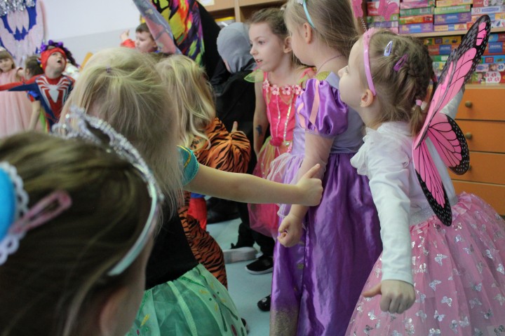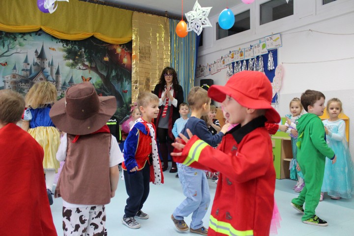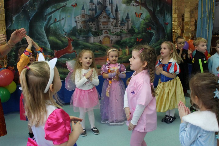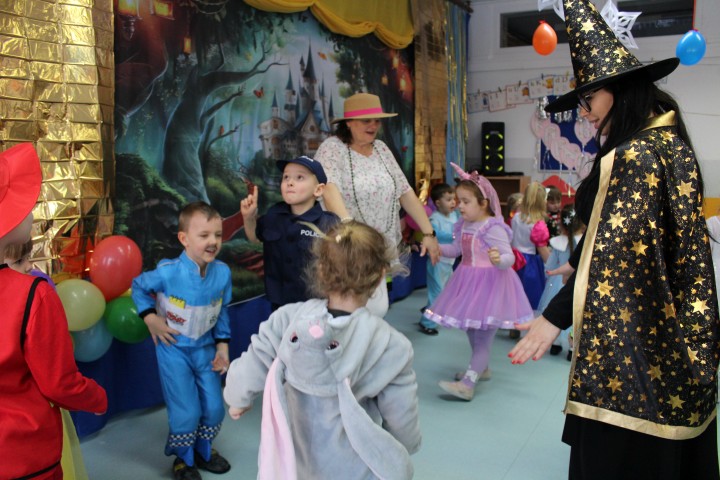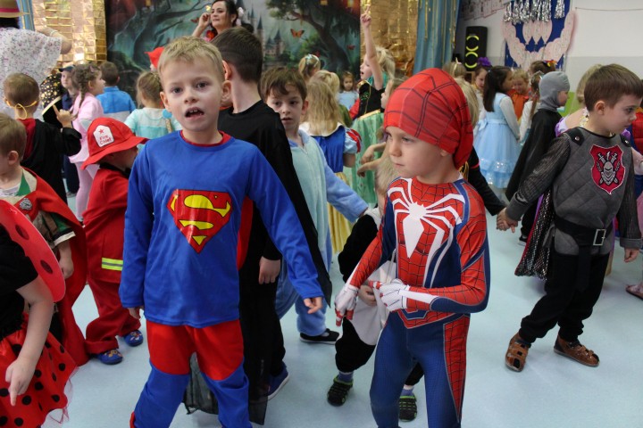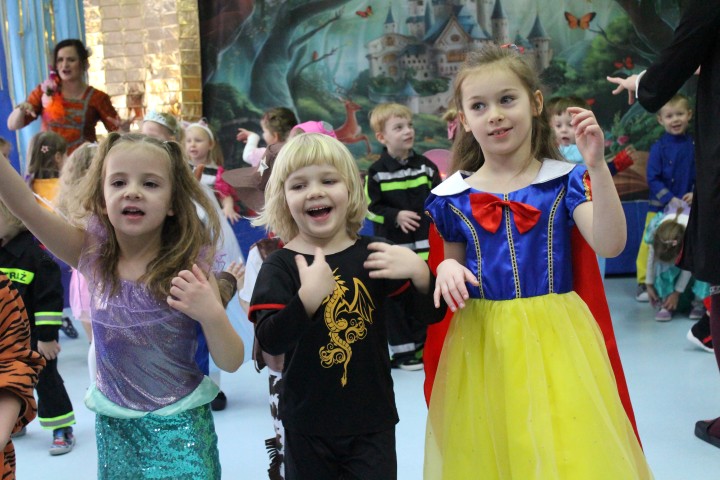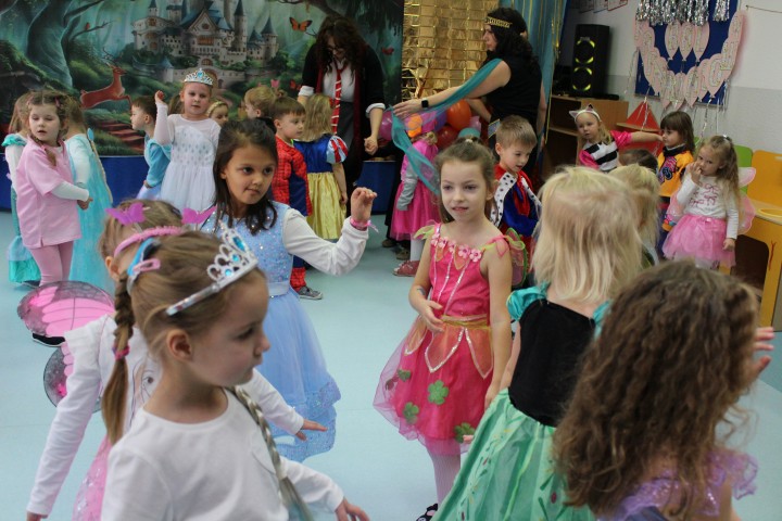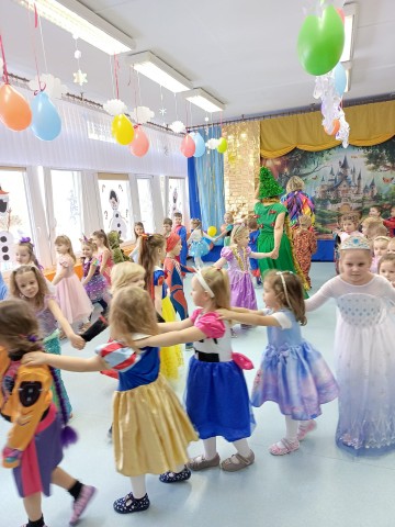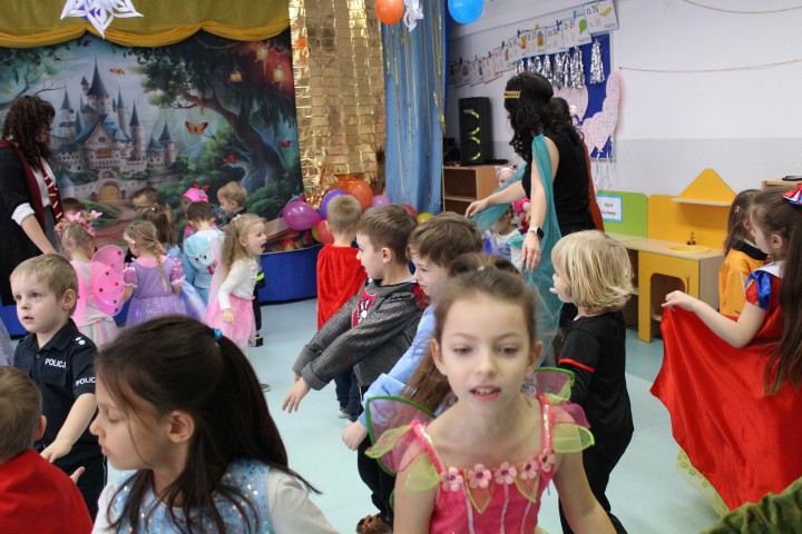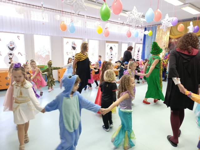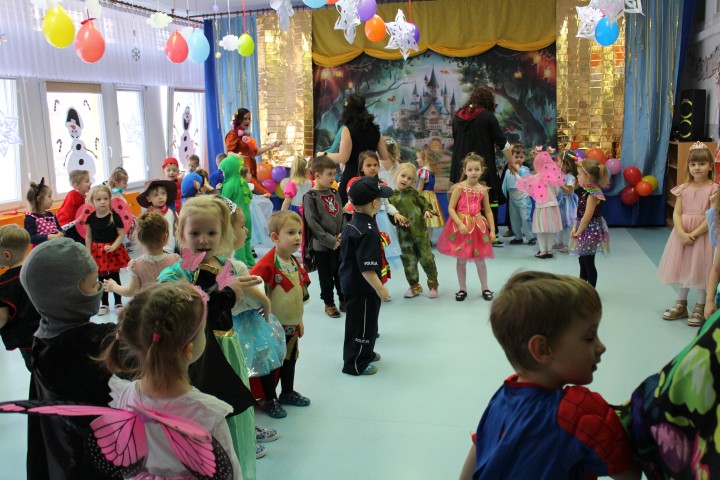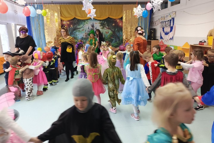 Tradycyjnie w okresie karnawału w naszym przedszkolu odbywa się uroczysty bal. Wspólnie z przedszkolakami wszystkich grup spotkamy się na pięknie udekorowanej sali balowej, pełnej kolorowych balonów oraz karnawałowych ozdób. W tym dniu podziwialiśmy niezwykle ciekawe i pomysłowe przebrania – na parkiecie mogliśmy spotkać bohaterów ulubionych bajek, księżniczki, superbohaterów oraz przedstawicieli różnych zawodów, takich jak strażacy, policjanci czy lekarze.