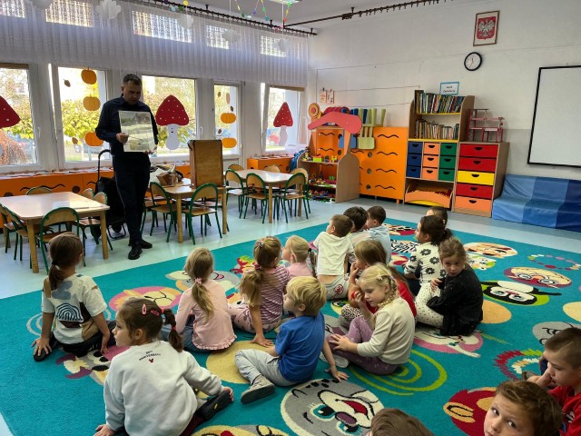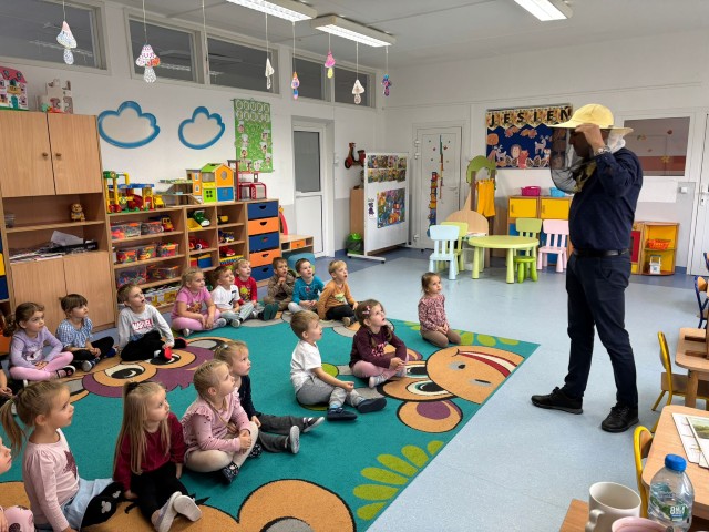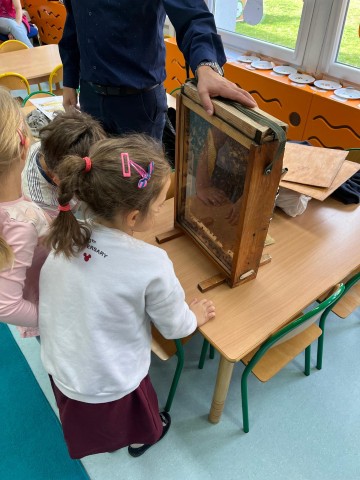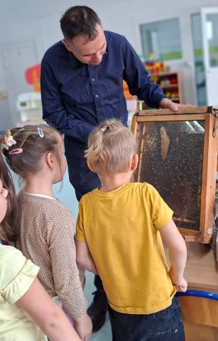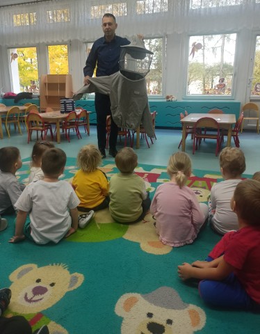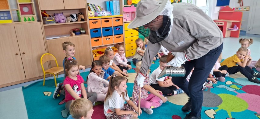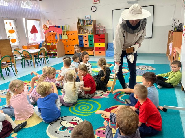 W dniu 22 października w naszym przedszkolu odbyły się warsztaty pszczelarskie, na których mieliśmy możliwość poznania tajników związanych z życiem pszczół oraz produkcją miodu. Podczas opowieści pszczelarza zdobyliśmy wiele cennych informacji dotyczących życia pszczół. W czasie spotkania mogliśmy zobaczyć strój pszczelarza oraz obejrzeć przybory, których używa w swojej codziennej pracy.