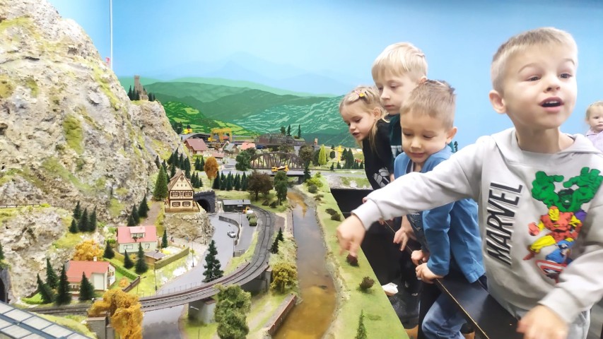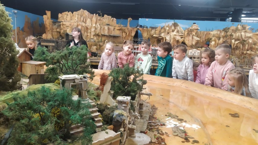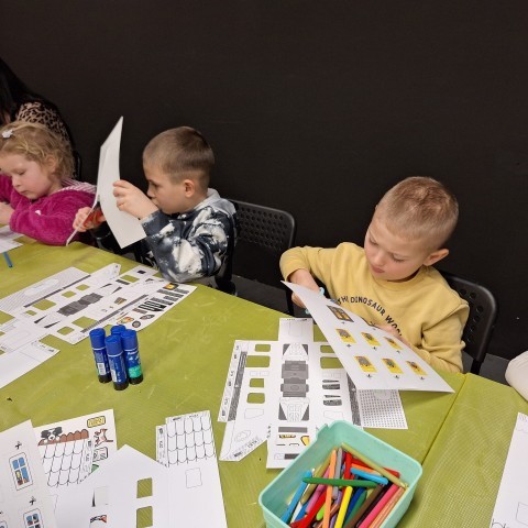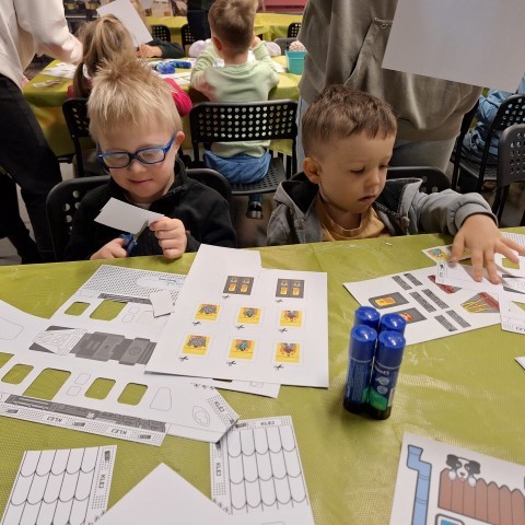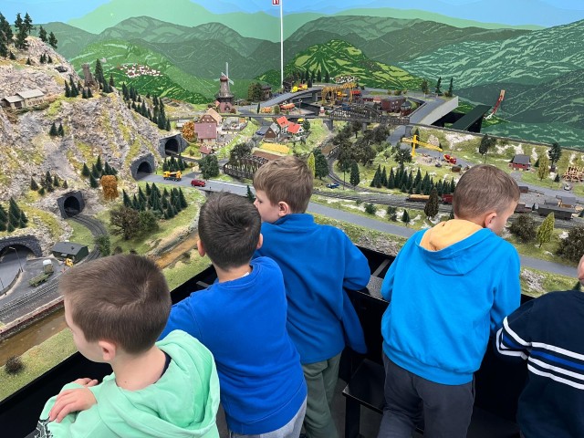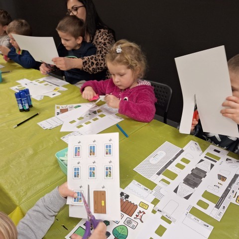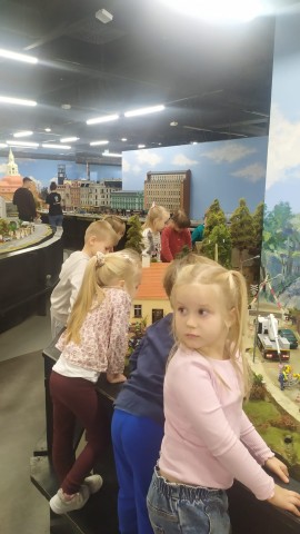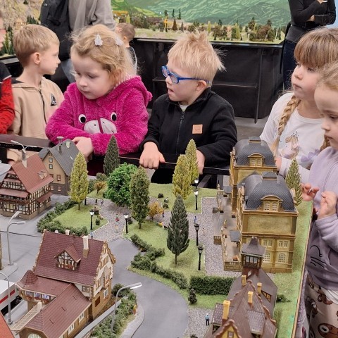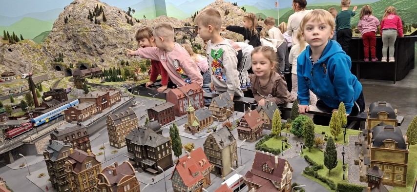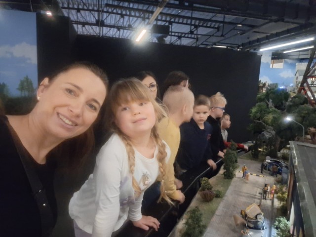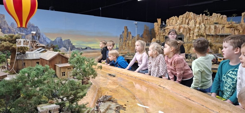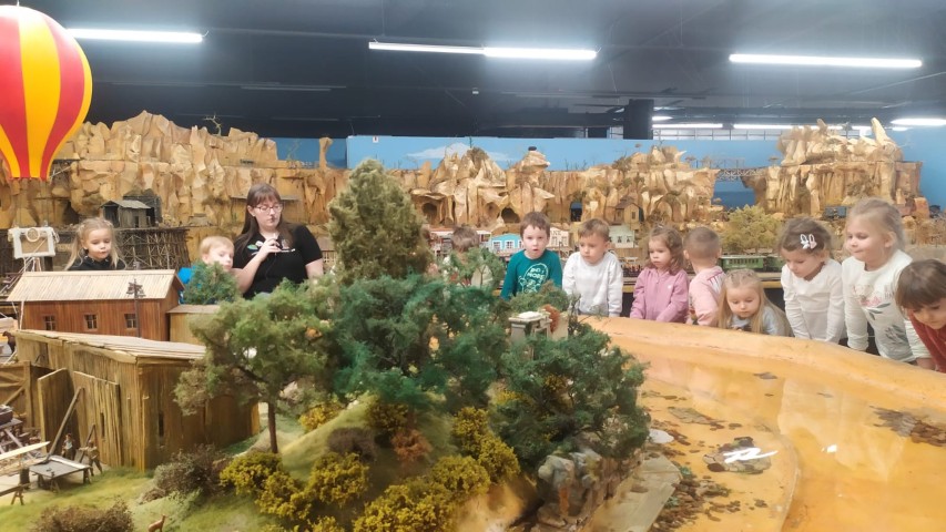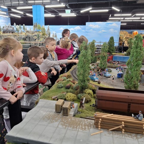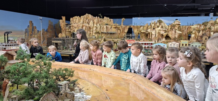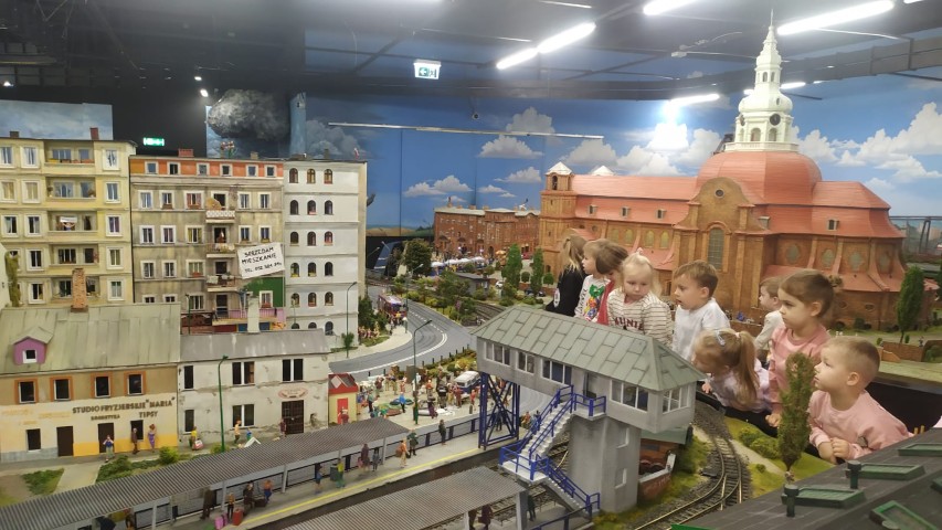 Duże emocje wzbudziła również makieta w stylu Dzikiego Zachodu, gdzie szukaliśmy Chudego z Toy Story. Następnie zobaczyliśmy niezwykłą scenę, na której z chmury padał prawdziwy deszcz na miniaturowe miasteczko — dzieci były oczarowane tym widokiem! Nie zabrakło też zimowej makiety, pełnej śniegu, która wprowadziła wszystkich w magiczny nastrój. W trakcie zwiedzania szukaliśmy też innych ukrytych postaci — dzieci wypatrywały m.in. Spidermana, co okazało się świetną zabawą i ćwiczeniem spostrzegawczości. Po obejrzeniu wszystkich ekspozycji wzięliśmy udział w warsztatach plastycznych, podczas których każdy z przedszkolaków mógł wykonać coś wyjątkowego — blok lub pociąg z papieru. Trzeba było wszystko wyciąć, skleić, pokolorować i złożyć — dzieci pracowały z ogromnym zaangażowaniem, a efekty ich pracy były naprawdę imponujące. To była wyjątkowa wycieczka, pełna radości, odkryć i wspólnej zabawy — z pewnością na długo pozostanie w pamięci wszystkich dzieci!