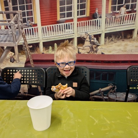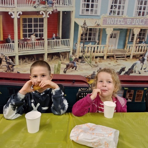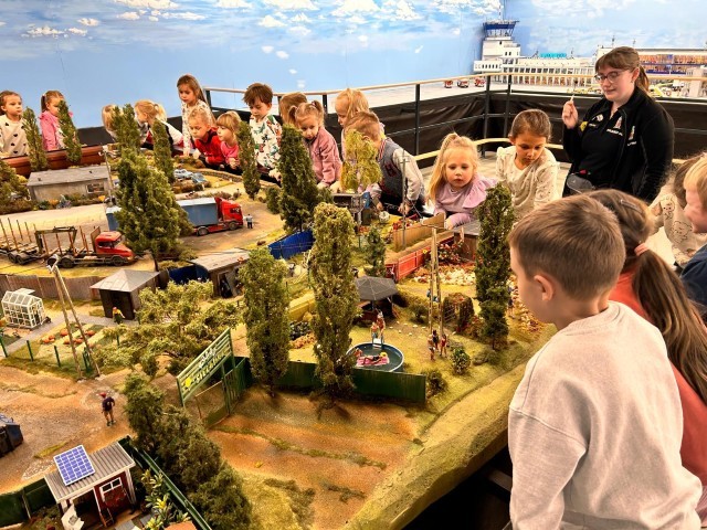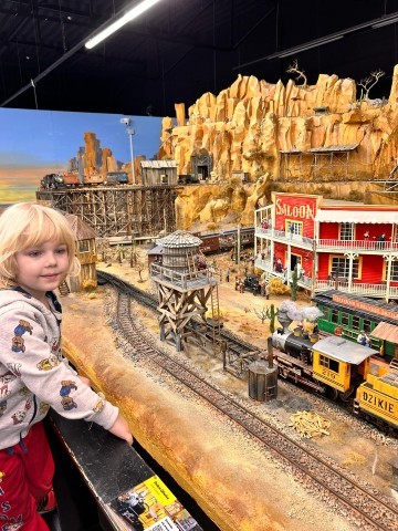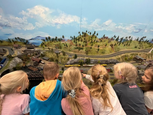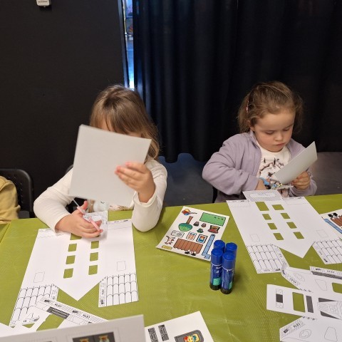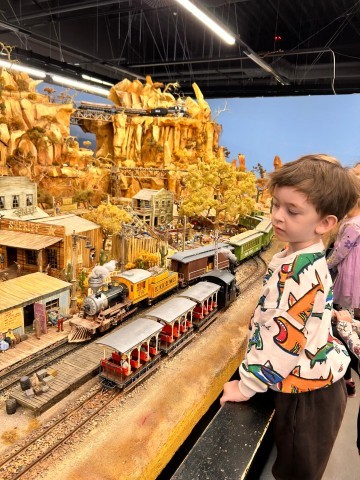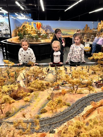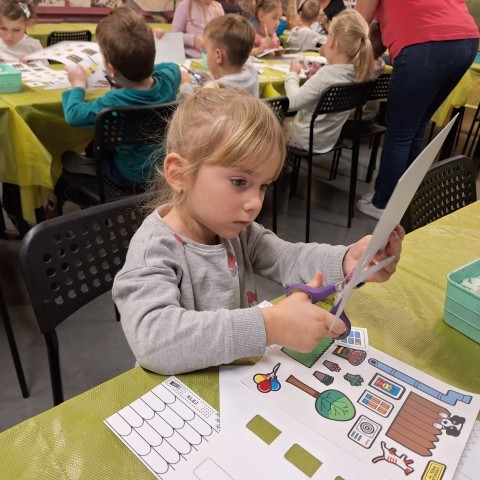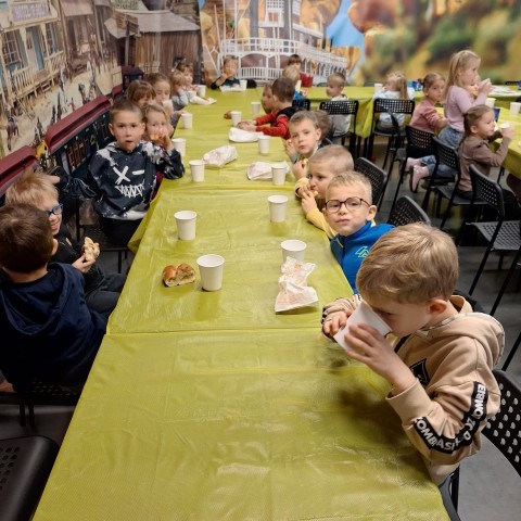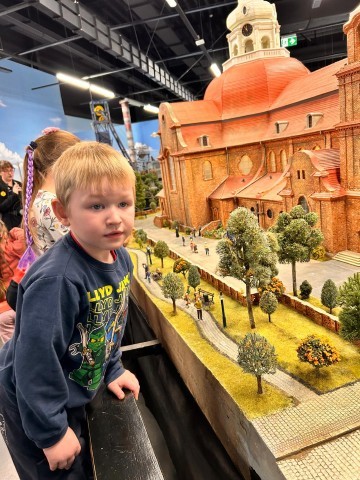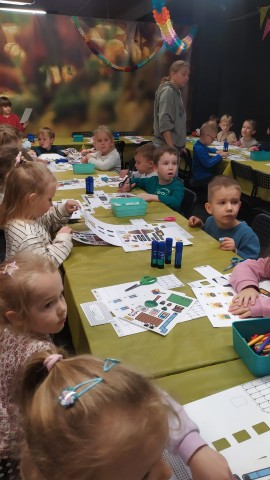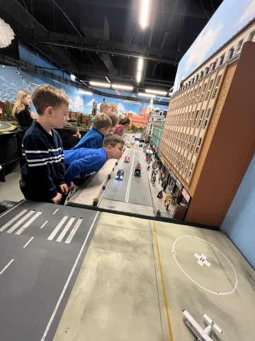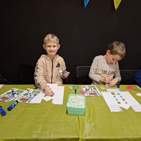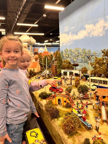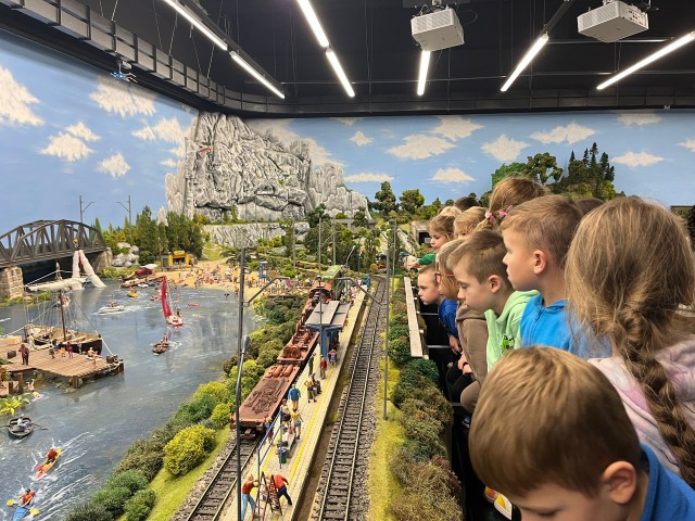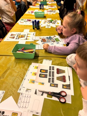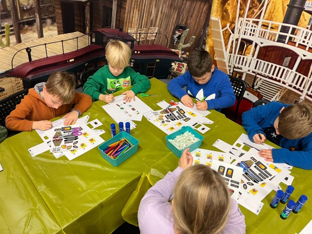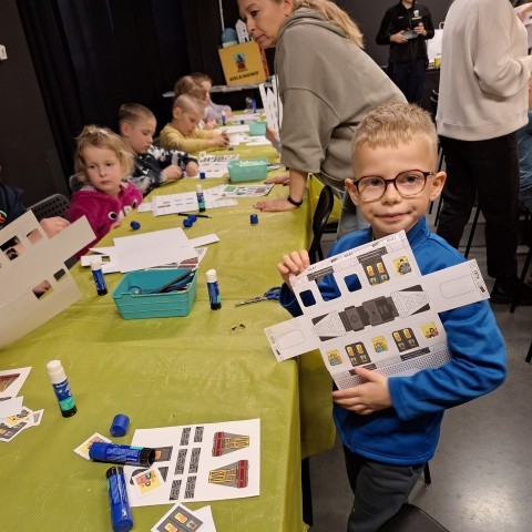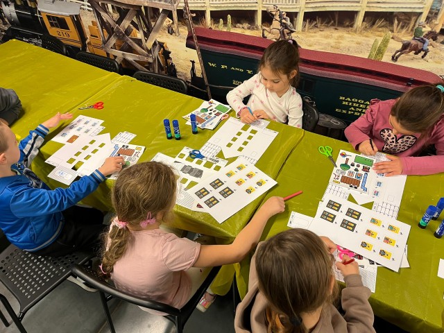 Duże emocje wzbudziła również makieta w stylu Dzikiego Zachodu, gdzie szukaliśmy Chudego z Toy Story. Następnie zobaczyliśmy niezwykłą scenę, na której z chmury padał prawdziwy deszcz na miniaturowe miasteczko — dzieci były oczarowane tym widokiem! Nie zabrakło też zimowej makiety, pełnej śniegu, która wprowadziła wszystkich w magiczny nastrój. W trakcie zwiedzania szukaliśmy też innych ukrytych postaci — dzieci wypatrywały m.in. Spidermana, co okazało się świetną zabawą i ćwiczeniem spostrzegawczości. Po obejrzeniu wszystkich ekspozycji wzięliśmy udział w warsztatach plastycznych, podczas których każdy z przedszkolaków mógł wykonać coś wyjątkowego — blok lub pociąg z papieru. Trzeba było wszystko wyciąć, skleić, pokolorować i złożyć — dzieci pracowały z ogromnym zaangażowaniem, a efekty ich pracy były naprawdę imponujące. To była wyjątkowa wycieczka, pełna radości, odkryć i wspólnej zabawy — z pewnością na długo pozostanie w pamięci wszystkich dzieci!