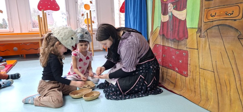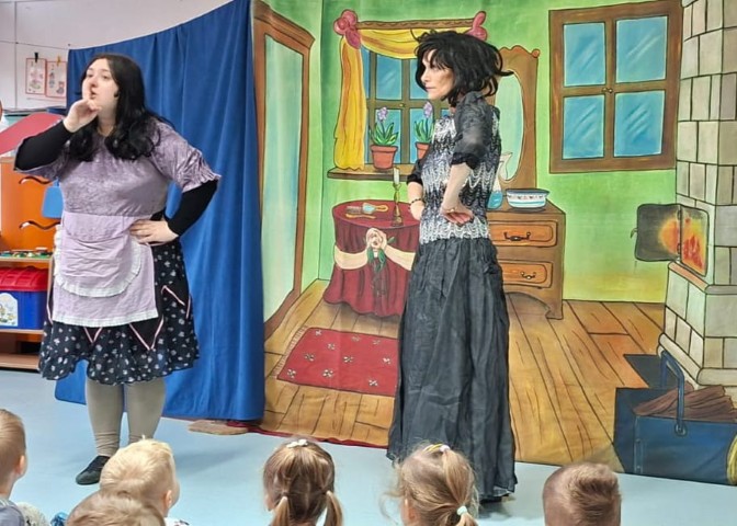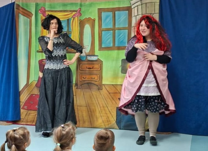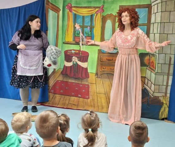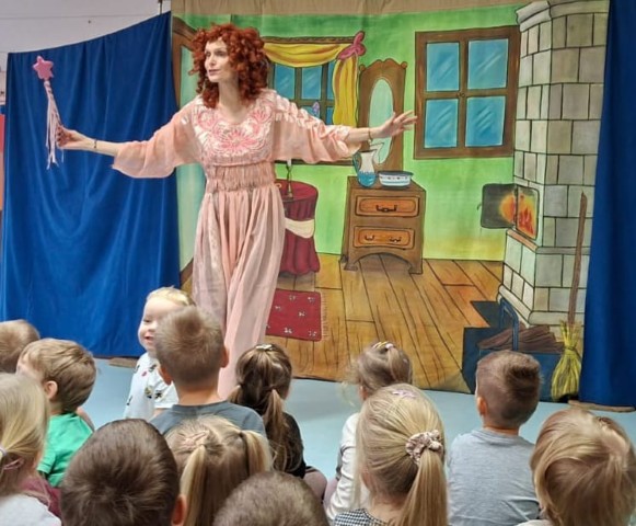 W poniedziałkowy ranek odwiedzili nas aktorzy teatru KRAK-ART z Krakowa. Na naszej przedszkolnej scenie pojawili się Kopciuszek, zła macocha oraz przystojny książę. Mogliśmy aktywnie brać udział w przedstawieniu —na chwilę wcielić się w role aktorów, wystąpić przed publicznością, a na zakończenie zatańczyć na weselu Kopciuszka i księcia.