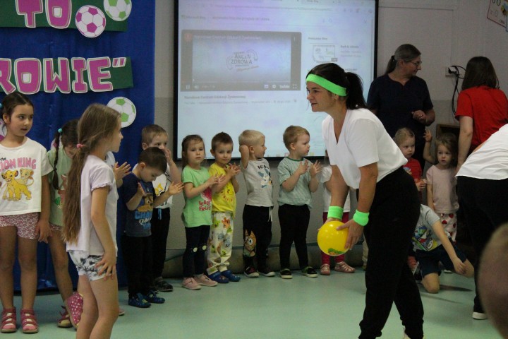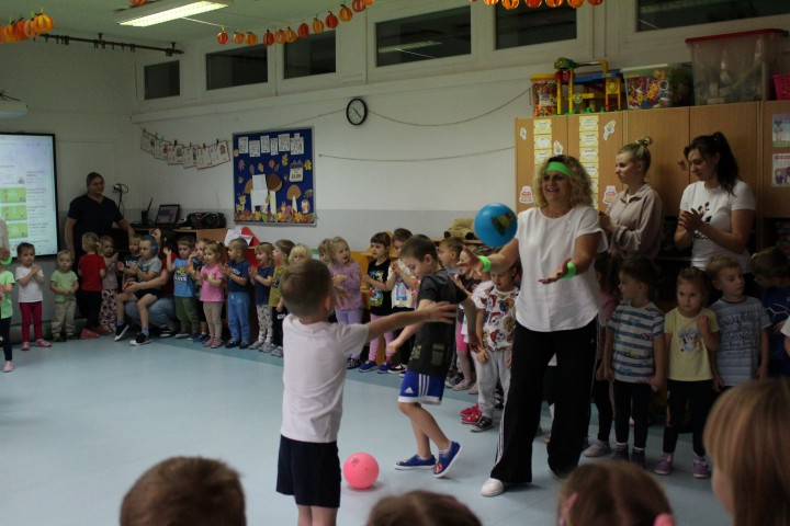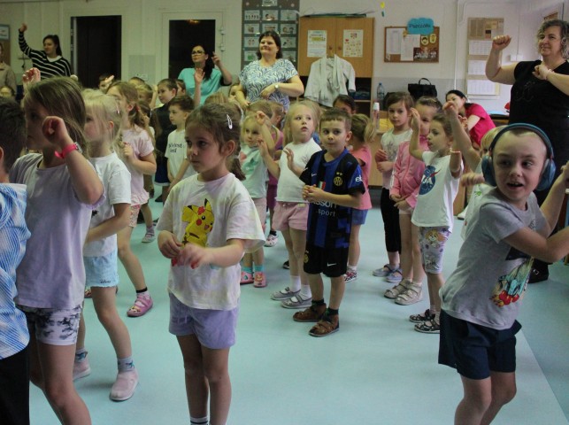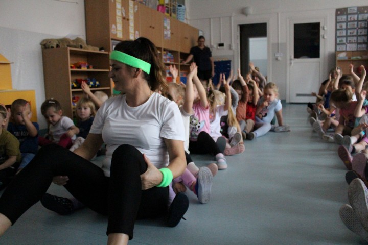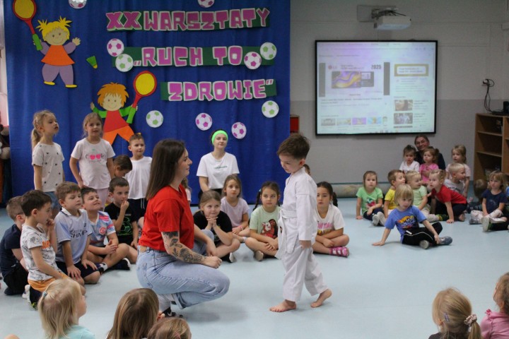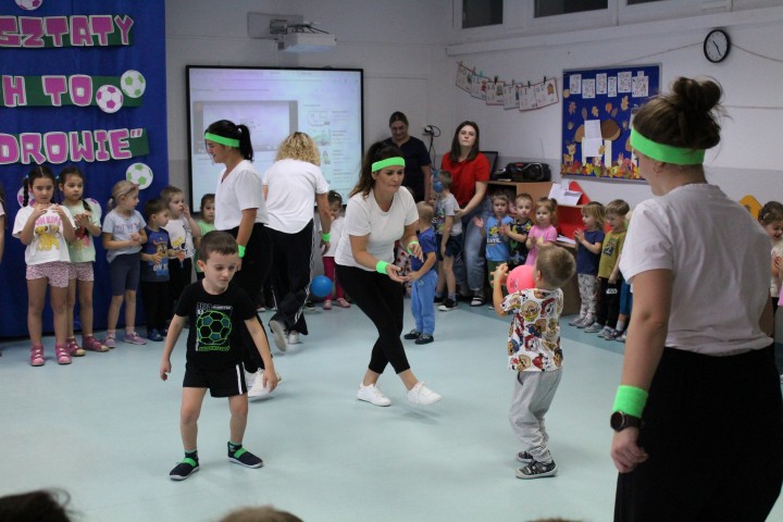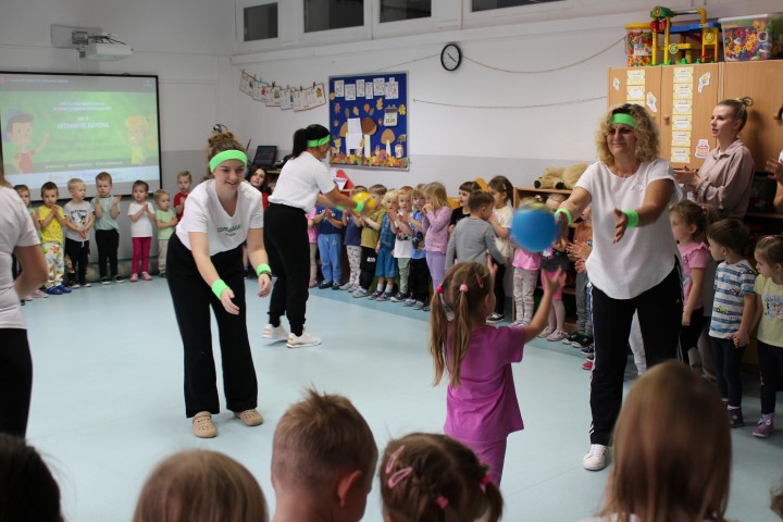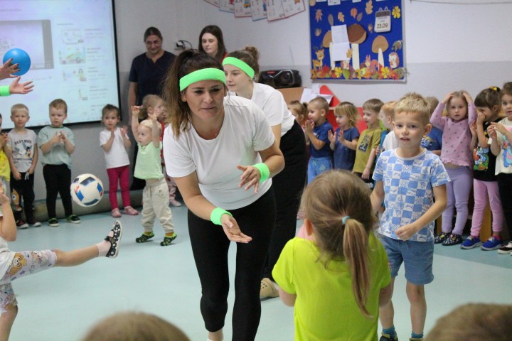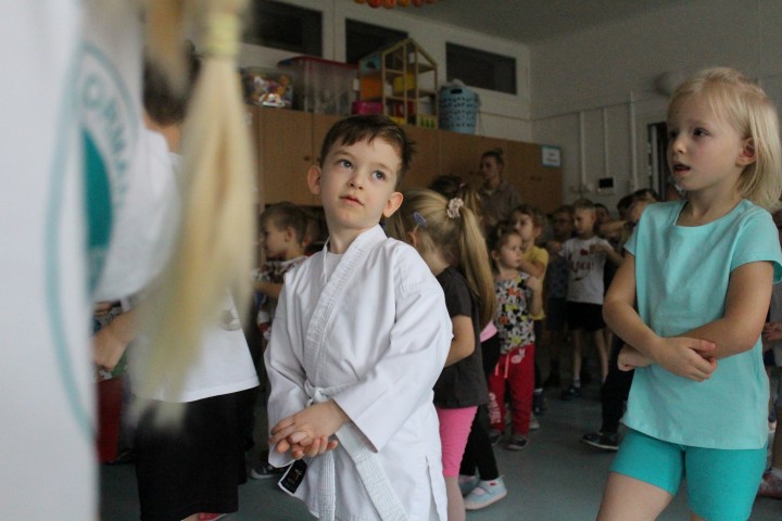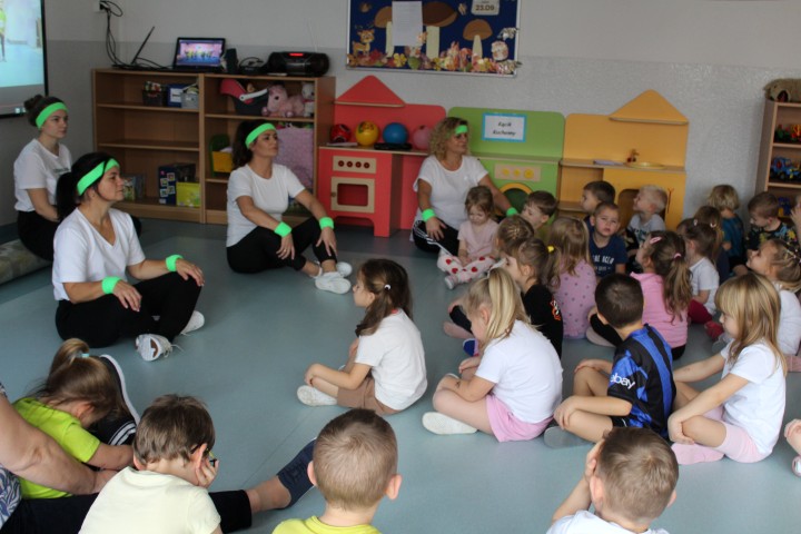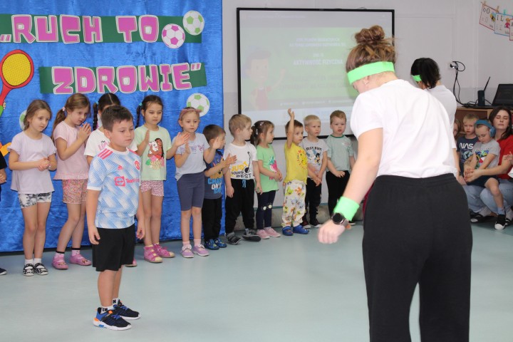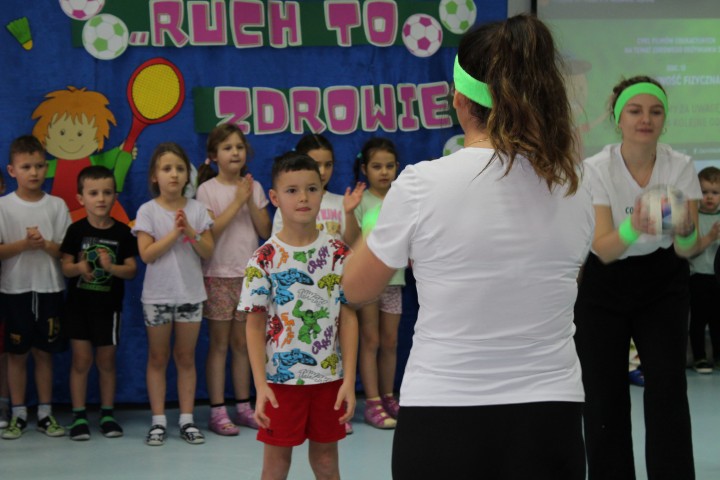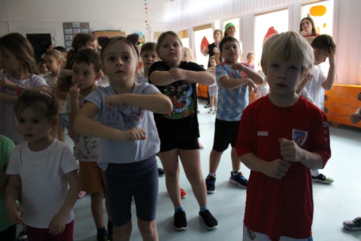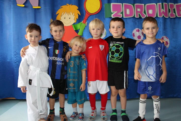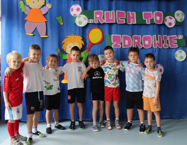 Hasło przewodnie tego dnia to "Ruch to zdrowie - aktywne przedszkolaki”. Nasze przedszkolne panie trenerki: Karolina, Asia, Bożena, Ewelina i Basia zachęcając do aktywności fizycznej przedstawiły film edukacyjny o potrzebie ruchu dla zdrowia. Następnie wszyscy zostaliśmy zaproszeni do zabaw ruchowych tj. ,,Tańcz i baw się z nami”, "Kolanko, kolanko”, Gąsienica”. Pani Karolina zaprezentowała nam strój karate oraz opowiedziała na czym polega trening i dlaczego warto trenować karate. Poznaliśmy różne dyscypliny sportowe układając puzzle w zespołach.