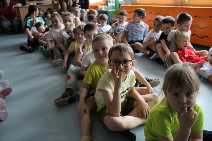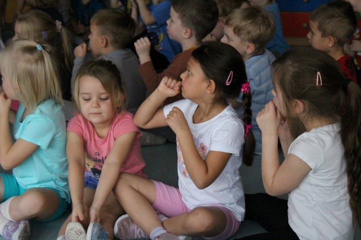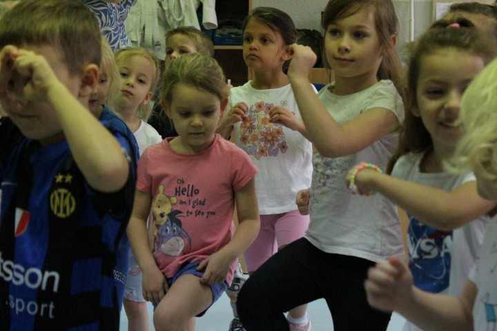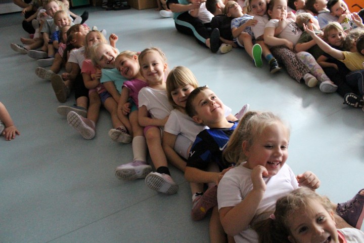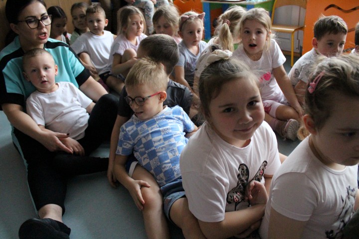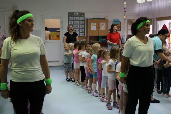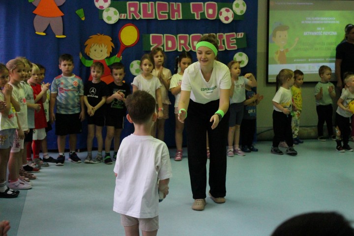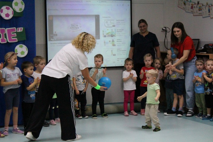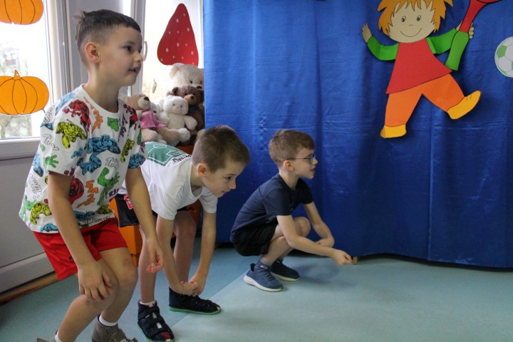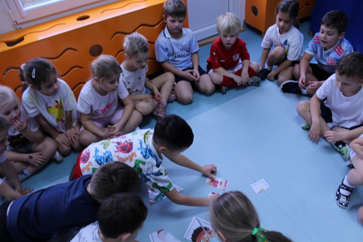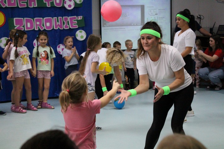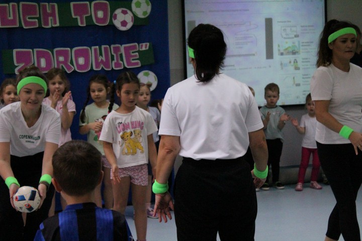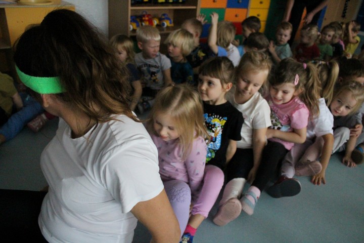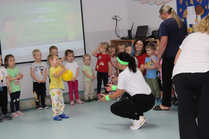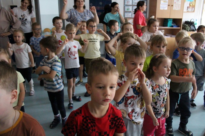 Hasło przewodnie tego dnia to "Ruch to zdrowie - aktywne przedszkolaki”. Nasze przedszkolne panie trenerki: Karolina, Asia, Bożena, Ewelina i Basia zachęcając do aktywności fizycznej przedstawiły film edukacyjny o potrzebie ruchu dla zdrowia. Następnie wszyscy zostaliśmy zaproszeni do zabaw ruchowych tj. ,,Tańcz i baw się z nami”, "Kolanko, kolanko”, Gąsienica”. Pani Karolina zaprezentowała nam strój karate oraz opowiedziała na czym polega trening i dlaczego warto trenować karate. Poznaliśmy różne dyscypliny sportowe układając puzzle w zespołach.