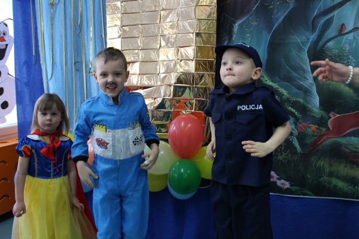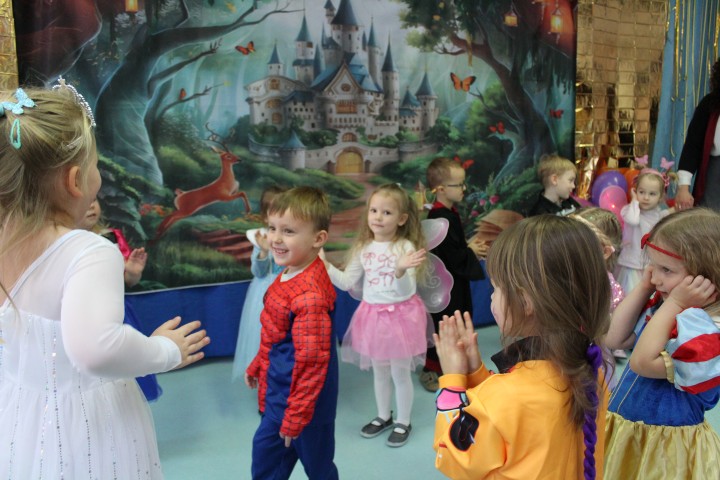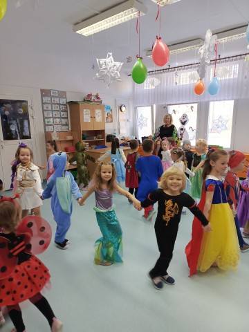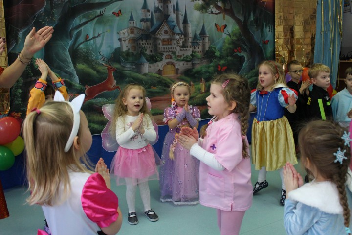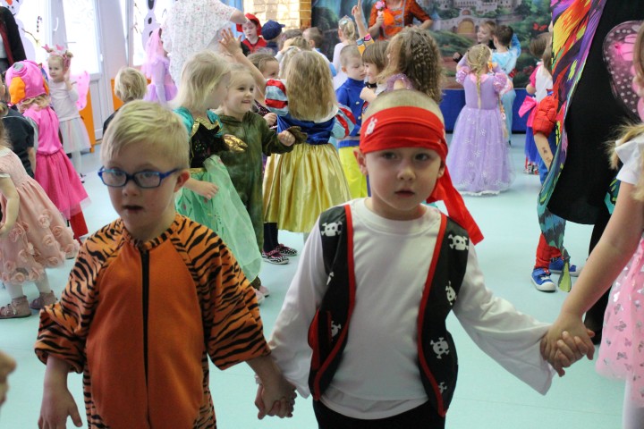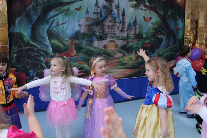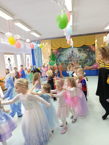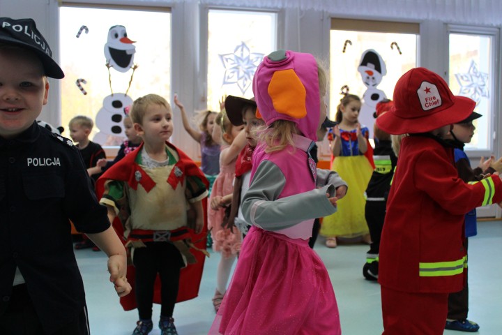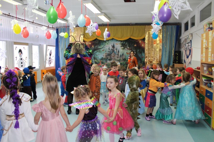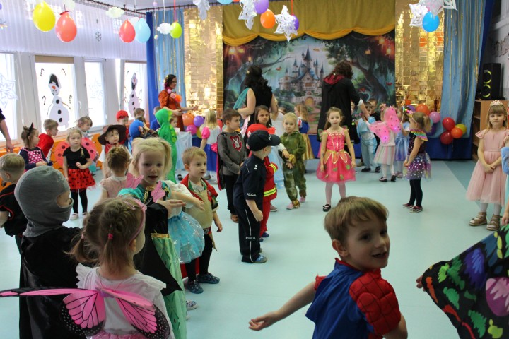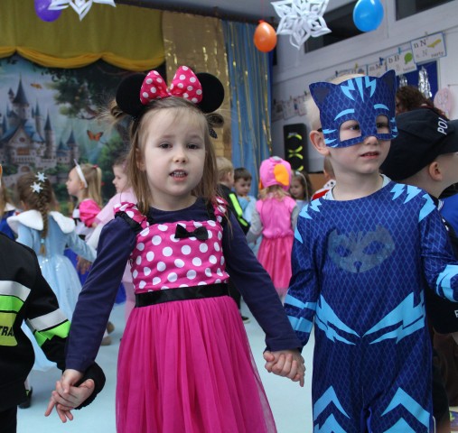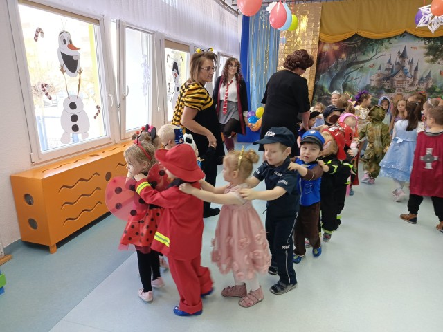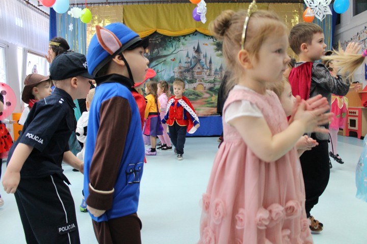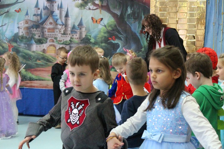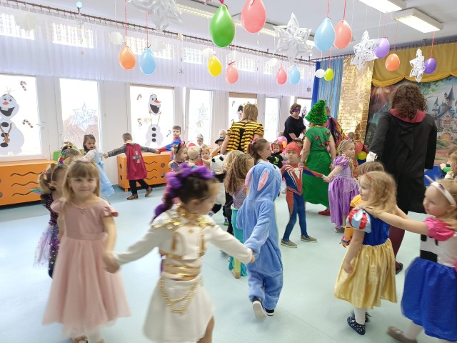Tradycyjnie w okresie karnawału w naszym przedszkolu odbywa się uroczysty bal. Wspólnie z przedszkolakami wszystkich grup spotkamy się na pięknie udekorowanej sali balowej, pełnej kolorowych balonów oraz karnawałowych ozdób. W tym dniu podziwialiśmy niezwykle ciekawe i pomysłowe przebrania – na parkiecie mogliśmy spotkać bohaterów ulubionych bajek, księżniczki, superbohaterów oraz przedstawicieli różnych zawodów, takich jak strażacy, policjanci czy lekarze.
