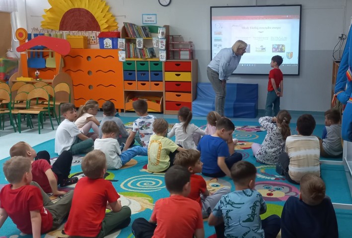 Dnia 26. 05. 2025r. nasze przedszkole odwiedziła pani Andżelika pracownik Wydziału Ochrony Środowiska Urzędu Miejskiego w Zawadzkiem, która przedstawiła prezentację multimedialną na temat dbania o środowisko. W spotkaniu brały udział przedszkolaki najstarszych grup. Dzieci zostały wprowadzone w tematykę związaną z zanieczyszczeniami powietrza, skutkami zdrowotnymi i profilaktyką.