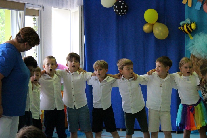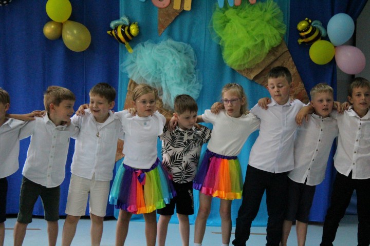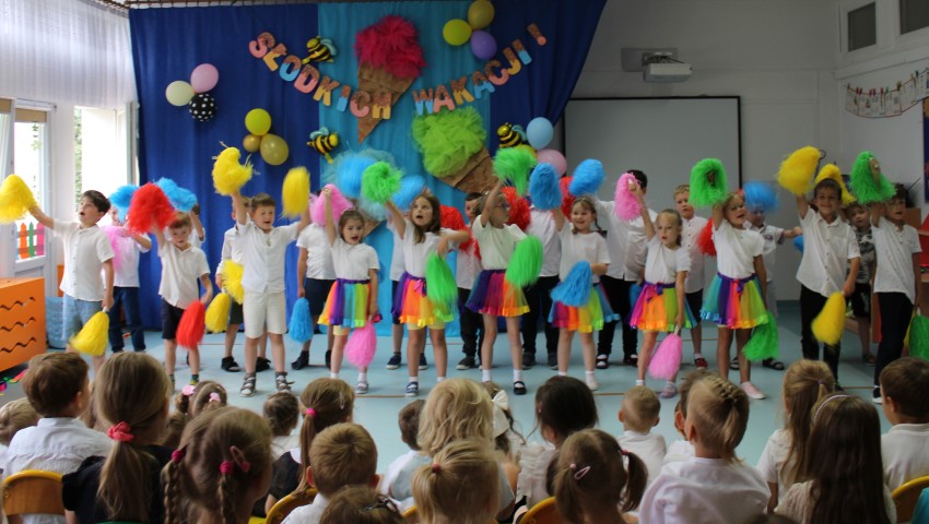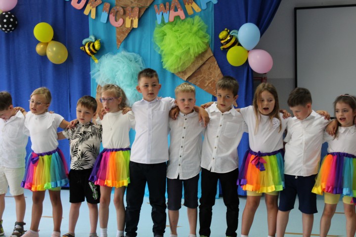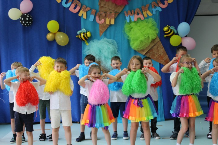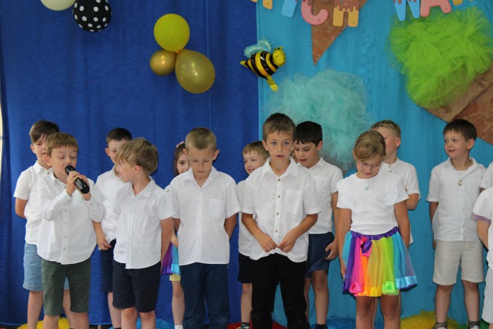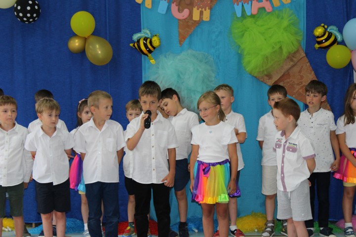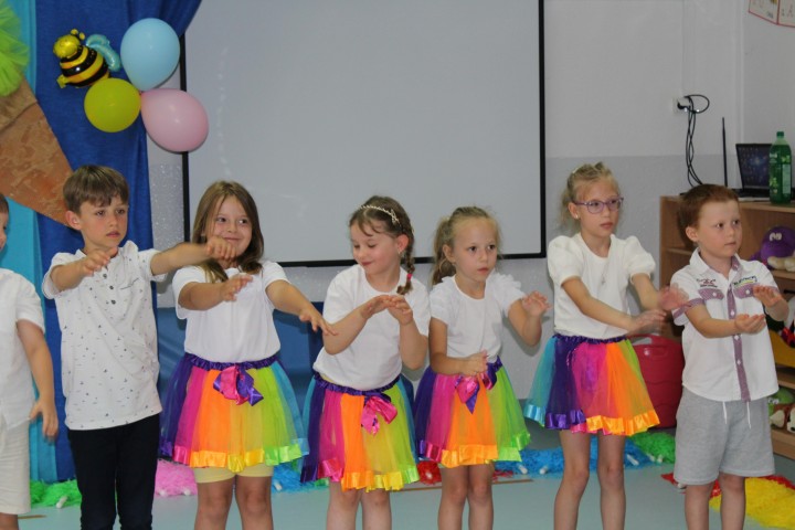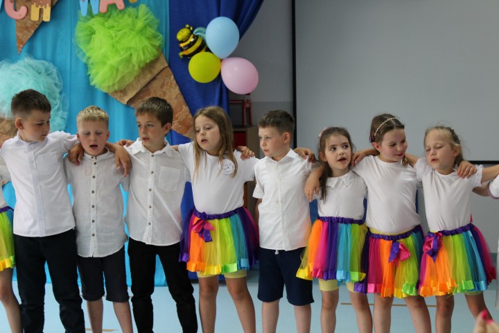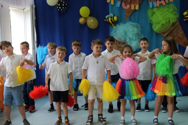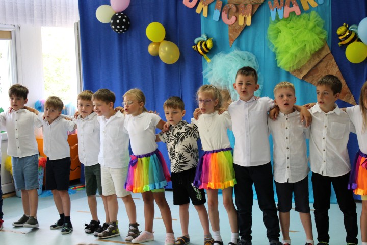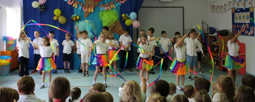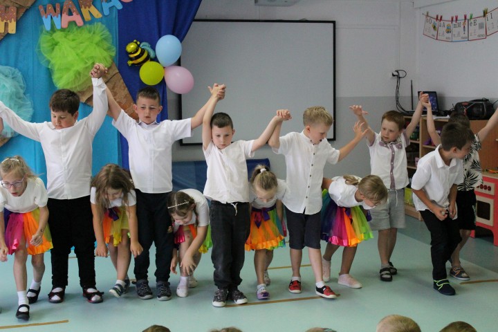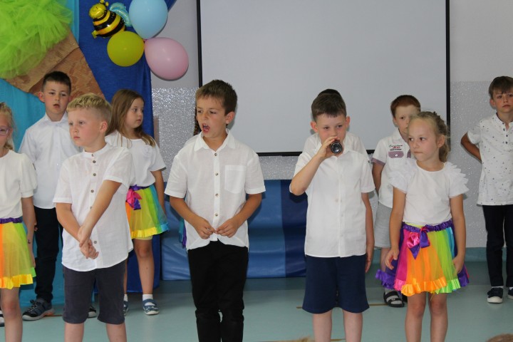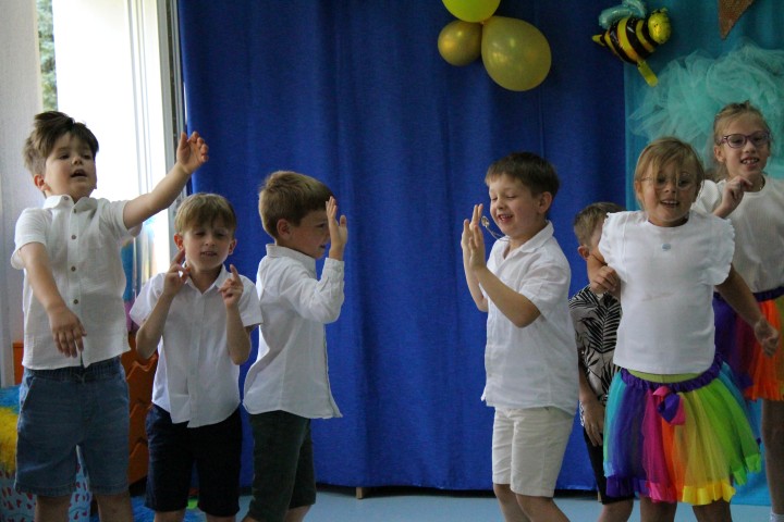 27 czerwca w naszym przedszkolu odbyła się uroczystość zakończenia roku przedszkolnego. Był to dzień pełen radości, wzruszeń i wspomnień, szczególnie dla naszych starszaków, którzy żegnają się już z przedszkolem i wyruszają w szkolną przygodę. Starszaki przedstawiły wszystkim przedszkolakom swój pożegnalny występ artystyczny, w którym w zabawny i ciepły sposób przedstawiły swoją przedszkolną drogę – od nieporadnych i nieśmiałych maluszków, przez pełne energii średniaki, aż po pewnych siebie i gotowych na szkołę starszaków.