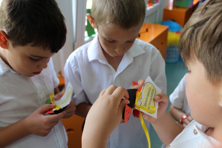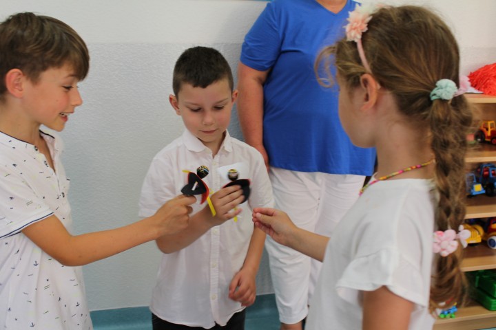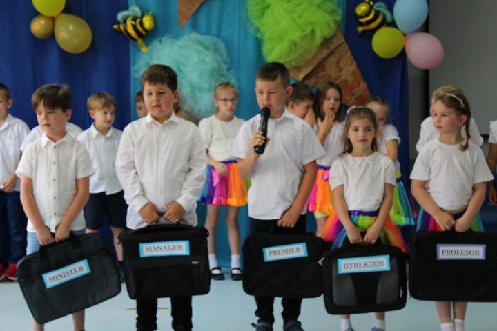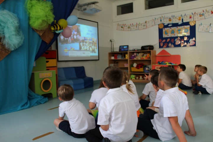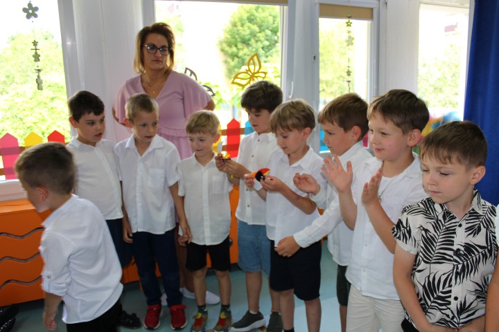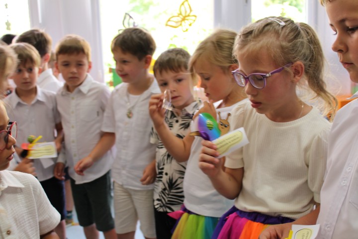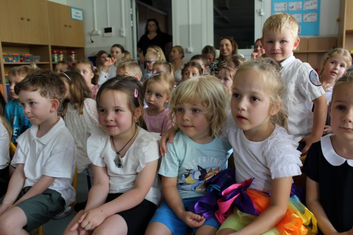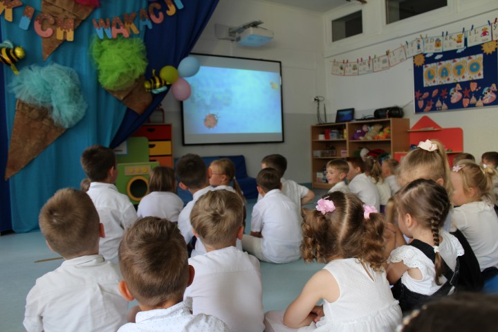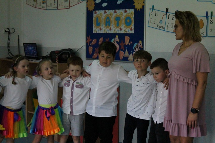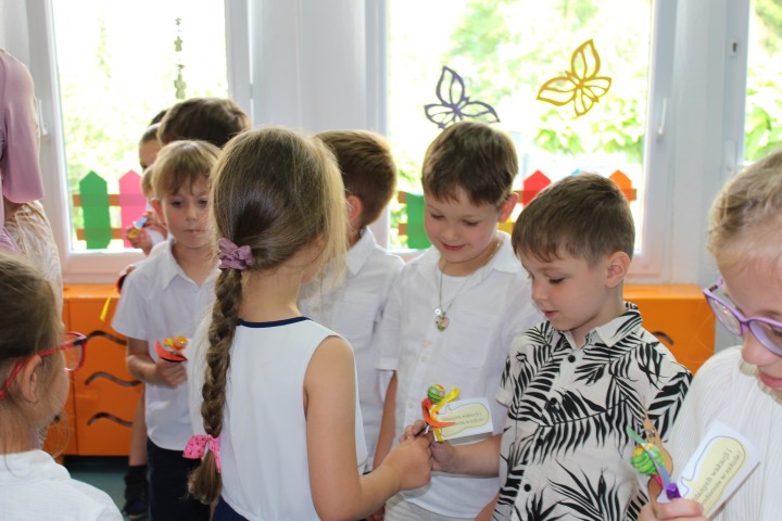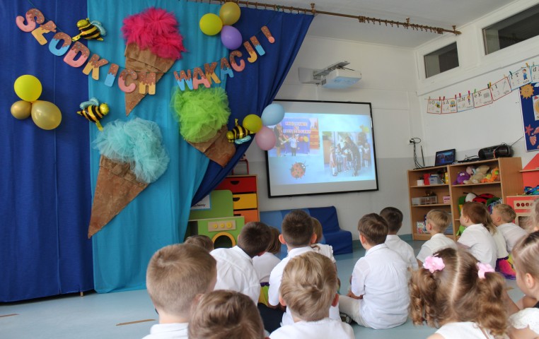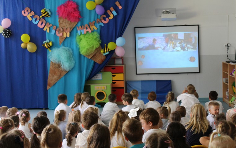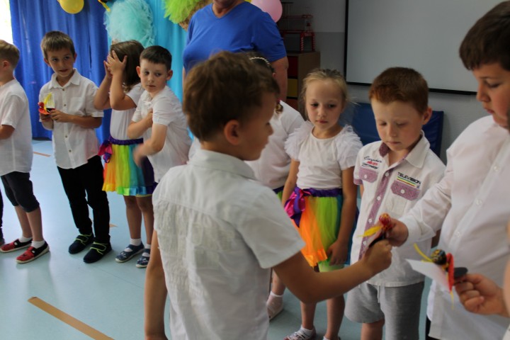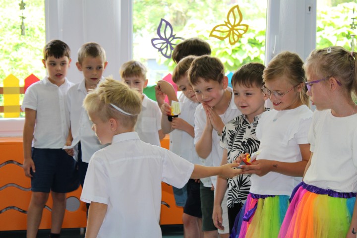 W trakcie występu nie zabrakło podziękowań dla pań za opiekę, cierpliwość i codzienne wsparcie. Dodatkowym, wzruszającym momentem uroczystości była prezentacja multimedialna wyświetlona na tablicy – składająca się ze zdjęć przedstawiających cały pobyt dzieci w przedszkolu. Była to piękna podróż w czasie, pełna uśmiechów, zabawy i wspólnych chwil. Na zakończenie średniaki wręczyły starszym kolegom pamiątkowe upominki. Teraz czekają na nas wakacje. Zobaczymy się w wrześniu . Starszakom życzymy powodzenia w szkole, wielu sukcesów i nowych przyjaźni!