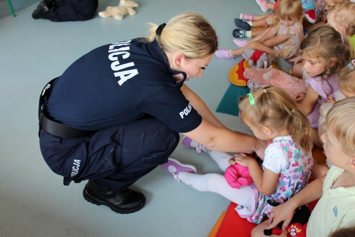 5 września w piątek nasze przedszkole odwiedzili wyjątkowi goście – policjanci. Podczas spotkania opowiedzieli dzieciom o zasadach udzielania pierwszej pomocy oraz pokazali przebieg resuscytacji. Następnie przedszkolaki miały okazję samodzielnie poćwiczyć na swoich misiach, ucząc się w praktyce, jak ważne jest szybkie reagowanie w sytuacjach zagrożenia.